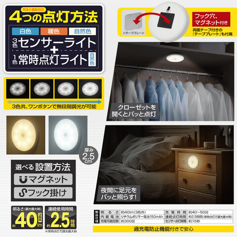 「センサーライト(白色/暖色/自然色)・常時点灯」と選べる4つの点灯モードを搭載し、シーンに合わせた使い方が可能です。
