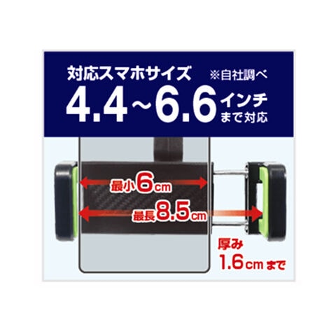 | スマートフォン対応サイズ | 約4.4~6.6インチまでのスマートフォン (幅もしくは高さ6~8.5cm、厚み1.6cmまでの機器) |