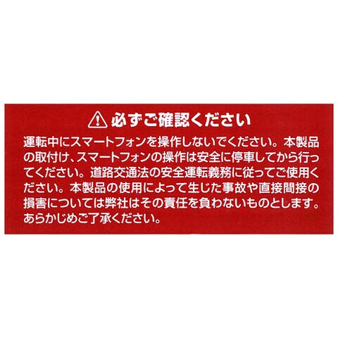 | 運転中にスマートフォンを操作しないでください。 本製品の取付け、スマートフォンの操作は安全に停車してから行ってください。 道路交通法の安全運転義務に従ってご使用ください。 本製品の使用に生じた事故や直接間接の損害については弊社はその責任を負わないものとします。 あらかじめご了承ください。 |