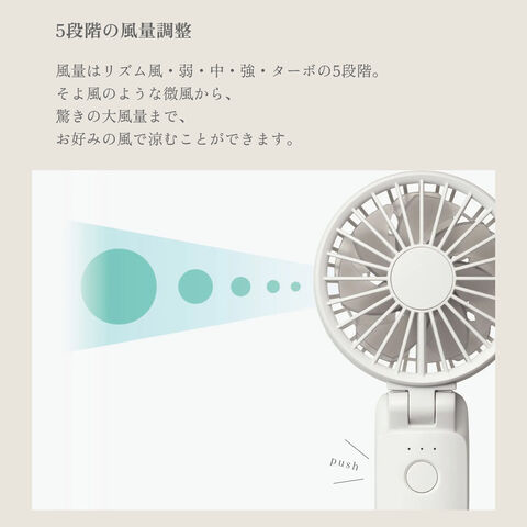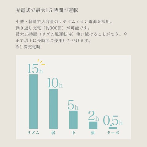 | 連続使用時間 | リズム風:約15時間 弱:約10時間 中:約5時間 強:約2時間 ターボ:約30分 ※ 満充電の状態からの目安です。 |