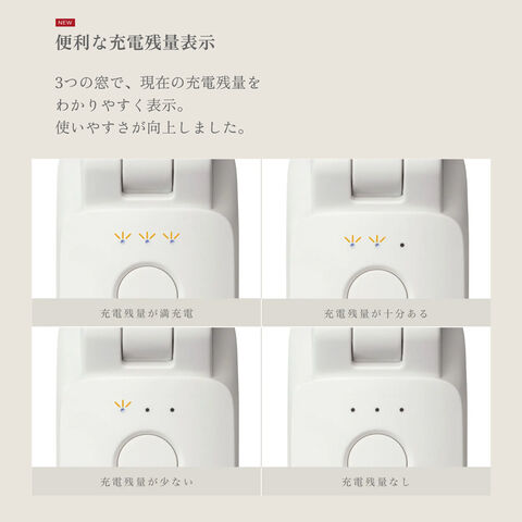 | ※ 充電池寿命と充電時間、使用時間は平均値であり、保証値ではありません。 ※ 充電池は周囲の温度や使用時間などの条件により、寿命が異なります。 ・ 掲載画像はイメージであり、実際の製品とは多少異なる場合があります。 ・ パッケージや個装形態は入荷時期によって変更となる場合があります。 ・ 製品の仕様は品質の向上・改善のため、予告なく変更となる場合があります。 |