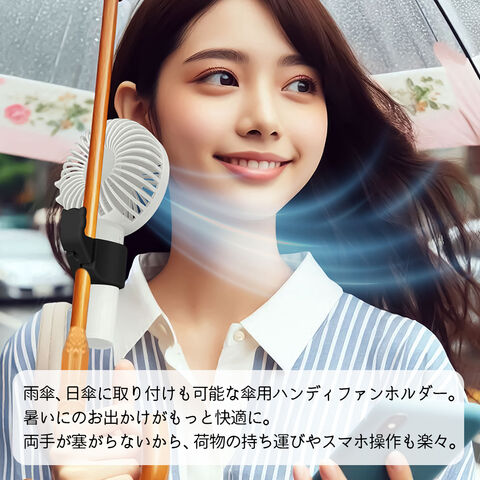 | ※ハンディファンや傘は付属しません。別途ご用意ください。 ※本製品はホルダーのみの商品です。対応サイズをご確認の上、お手持ちのハンディファンや傘に取り付けてご使用ください。 ※全てのファンに対応しているわけではございません。お使いのファンの形状や種類によってはご使用いただけない場合があります。 ※設置する場所や素材によってはゴムの跡や色移りが発生する場合があります。 ※耐荷重は形状等により異なる場合があります。 |