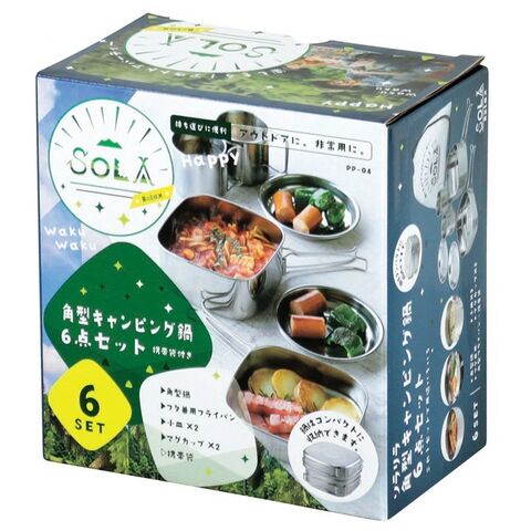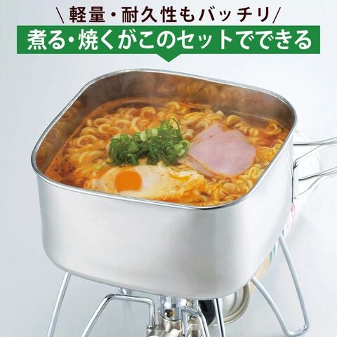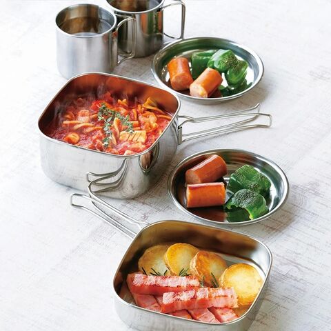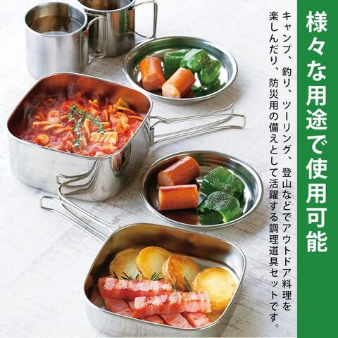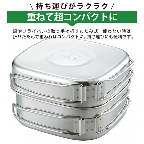 | 材質 | 角型鍋・フタ兼用角型フライパン:本体/ステンレス鋼(クロム13%)、ハンドル/ステンレス鋼 マグカップ:ステンレス鋼(クロム13%) 小皿:ステンレス鋼(クロム13%) 携帯袋:不織布(ポリプロピレン) |
