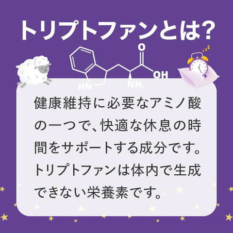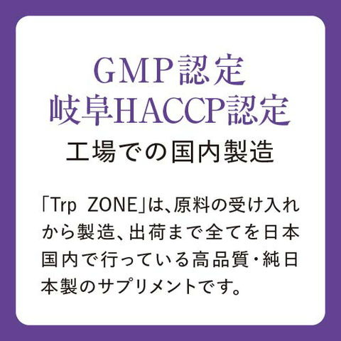 | 特徴 | Trp ZONEは、毎日の“心地よい時間”を支える「L-トリプトファン」を250mg/粒、1日を活発に元気に応援する「GABA」を25mg/粒、トリプトファンの働きをサポートする栄養素「ビタミンB6」を9mg/粒、ゆらぎがちな心に、そっと寄り添う自然の力「ラフマ葉抽出物」を1mg/粒、監修医師のこだわり配合で製品化が実現した男女兼用の健康補助食品です。 |
