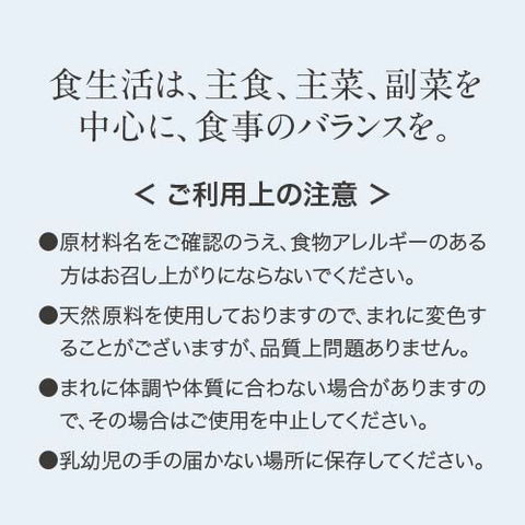| ご利用上の注意 | ●原材料名(ここをクリックし)をご確認のうえ、食物アレルギーのある方はお召し上がりにならないでください。 ●天然原料を使用しておりますので、まれに変色することがございますが、品質上問題ありません。 ●まれに体調や体質に合わない場合がありますので、その場合はご使用を中止してください。 ●乳幼児の手の届かない場所に保存してください。 |