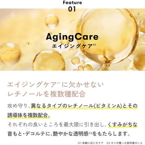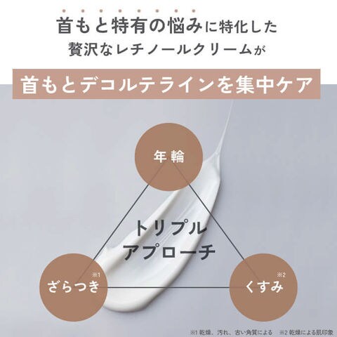 | 特徴 | 患者様のお悩みから生まれたレチノール(ビタミンA※)配合の首もと・デコルテクリーム。首もとのエイジングサインをケアし、しっかり保湿して肌をまもります。 ※レチノール、パルミチン酸レチノール、リノール酸レチノール(整肌成分) |