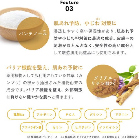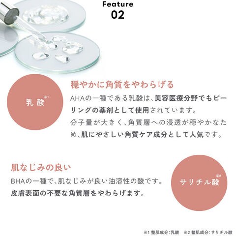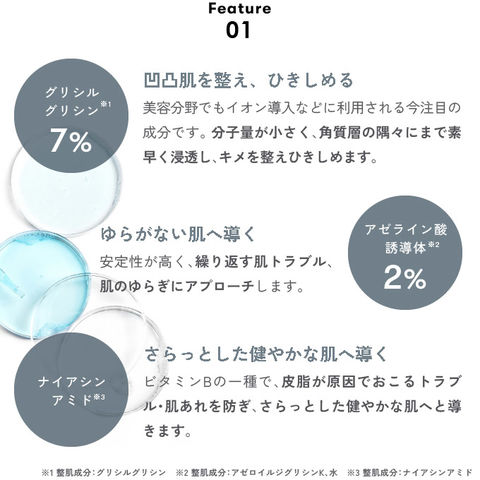 | 全成分 | 水、グリシルグリシン、BG、ナイアシンアミド、ペンチレングリコール、アゼロイルジグリシンK、トレハロース、乳酸、サリチル酸、パンテノール、グリチルリチン酸2K、クエン酸、PCA-Na、乳酸Na、アルギニン、アスパラギン酸、PCA、グリシン、アラニン、セリン、バリン、イソロイシン、トレオニン、プロリン、ヒスチジン、フェニルアラニン、カプリリルグリコール、PEG-60水添ヒマシ油、クエン酸Na、1,2-ヘキサンジオール、フェノキシエタノール |