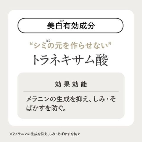 | 成分 | 有効成分:トラネキサム酸、グリチルリチン酸ジカリウム、アラントイン その他成分:精製水、1.2−ヘキサンジオール・1.2−オクタンジオール混合物、1.2−ペンタンジオール、1.3−ブチレングリコール、L−システイン、N−アセチルチロシン、アルピニアカツマダイ種子エキス、アルブチン、カッコンエキス、カルボキシビニルポリマー、キウイエキス、キサンタンガム、水酸化カリウム、トリメチルグリシン、濃グリセリン、ヒアルロン酸ナトリウム(2)、ピログルタミン酸イソステアリン酸ポリオキシエチレン硬化ヒマシ油、フェノキシエタノール、プラセンタエキス(1)、ボタンエキス、メタリン酸ナトリウム、リン酸L−アスコルビルマグネシウム |