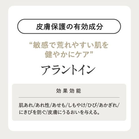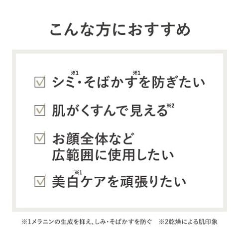 | 特徴 | 【3つの有効成分+4つのサポート成分で美白※1を追求】 美白※1有効成分としてトラネキサム酸を配合。 さらに有効成分グリチルリチン酸ジカリウム、アラントインに加えて、4つのサポート成分※2も配合しました。 全顔に使用しやすい美容液タイプで、デリケートな肌にうるおいを与えます。 無香料・無着色・パラベンフリー・エタノールフリー・ノンコメドジェニックテスト・パッチテスト済み ※すべての方にニキビ、刺激が起きないわけではありません ※1:メラニンの生成を抑え、しみ・そばかすを防ぐ ※2:アルブチン、プラセンタエキス(1)、L-システイン、ヒアルロン酸ナトリウム(2)(すべて整肌成分) |