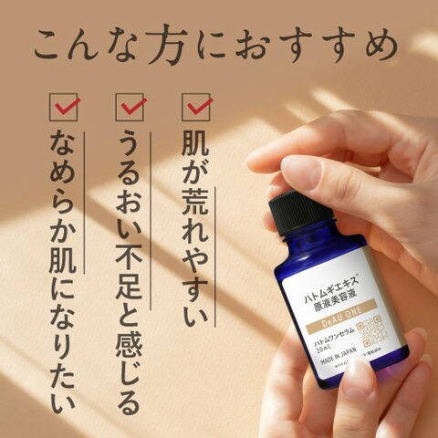 | 特徴 | 国産ハトムギ種子エキスの原液(※)を100%配合。 ハトムギの力を最大限に活かせるよう、シンプルに設計した美容液です。 顔、首、胸元などの広範囲の気になる箇所にやさしく馴染み、肌をやわらげます。 なめらかでしっとりとハリツヤのある美しい肌に導きます。 ※水、BG、ハトムギ種子エキス |