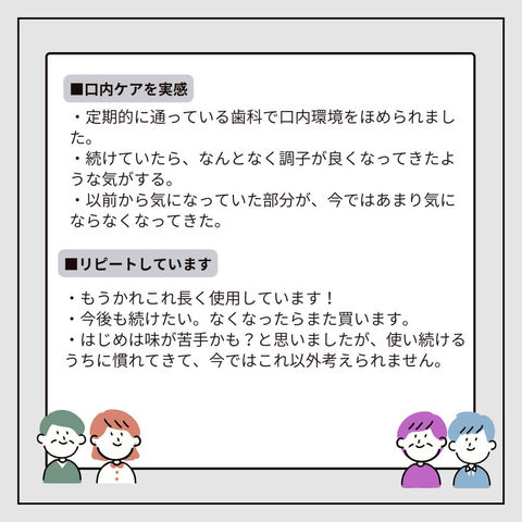 | 成分 | グリセリン(潤滑剤)、水、塩化Mg(清掃剤)、キサンタンガム(粘結剤)、 ハッカ油(清涼剤)、ティートリー葉油(着香剤)、 PEG-60水添ヒマシ油(可溶化剤)、フェノキシエタノール(防腐剤) |