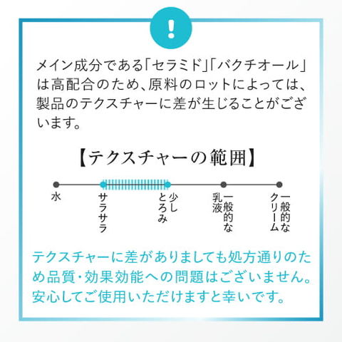 | 特徴 | セラミド(※1)を高濃度(※2)に16%配合した乳液です。ナノエマルジョン技術により、乳液でありながらまるで水のようなサラサラしたテクスチャー。肌に馴染みやすくスッと浸透(※3)し、もっちりとしたうるおいで包み込みます。 強く乾燥を感じる方、保湿をしていてもカサつく肌のエイジングケア(※4)に、肌本来の美しく保つ力であるバリア機能をサポートします。 5種類のヒト型セラミド(※5)、レチノール(※6)、バクチオール(※7)、植物幹細胞エキス(※8)などの大人のゆらぎ肌に嬉しい成分や12種類のアミノ酸(※9)を配合した、美容成分たっぷりの乳液です。 ※1 セラミドAP、セラミドNG、セラミドNP、セラミドAG、セラミドEOP、ラウロイルグルタミン酸ジ(フィトステリル/オクチルドデシル)(保湿成分) ※2 当社製品比 ※3 浸透は角質層まで ※4 年齢に応じたお手入れ ※5 セラミドAP、セラミドNG、セラミドNP、セラミドAG、セラミドEOP(保湿成分) ※6 パルミチン酸レチノール(肌を整える成分) ※7 保湿成分 ※8 リンゴ果実培養細胞エキス(保湿成分) ※9 PCA-Na、アルギニン、アスパラギン酸、グリシン、アラニン、セリン、バリン、トレオニン、イソロイシン、プロリン、ヒスチジン、フェニルアラニン(保湿成分) |