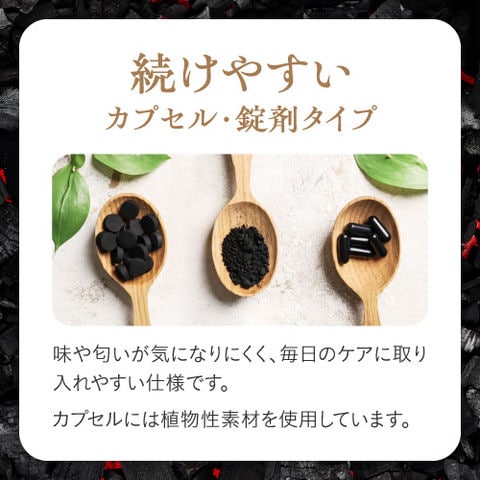 | 特徴 | カプセルの中身は100%純炭粉末。 1粒あたり180mg、1日目安量当たり1080mg入っているので、しっかりと純炭粉末だけをとることができます。 食べる純炭きよらカプセルタイプは、高純度結晶セルロースを国内自社工場で焼成した純炭粉末を植物性カプセルに充填しました。 原料からカプセルまで全ての素材が植物性由来です。 |