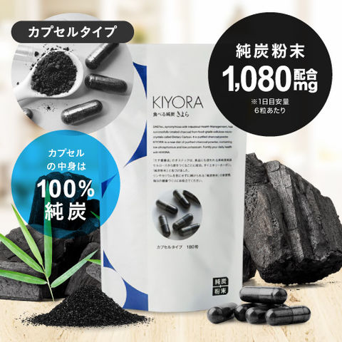 食べる純炭 きよら kiyora カプセルタイプ 180粒 1個 純炭粉末 炭 サプリメント 純炭きよら 活性炭 炭サプリ 炭パウダー 食用 食べる炭 サプリ