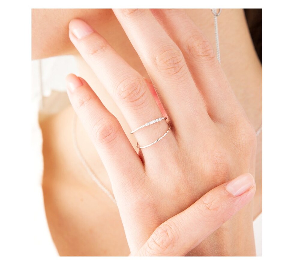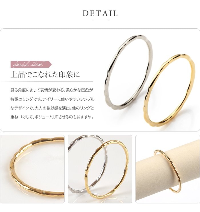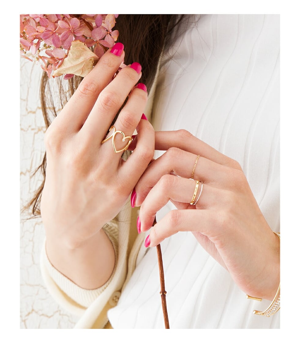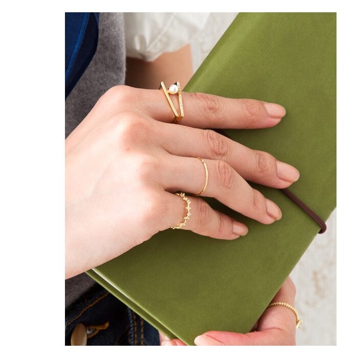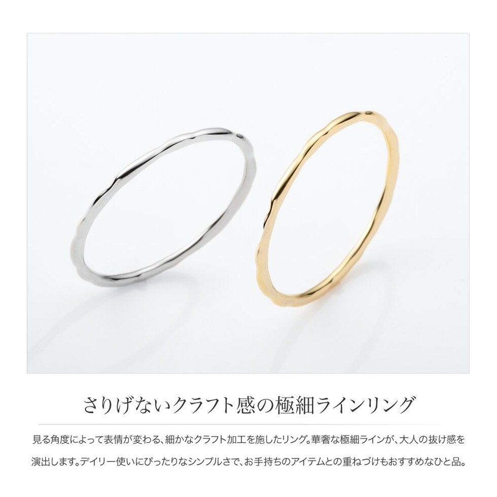 見る角度によって表情が変わる、細かなクラフト加工を施したリング。華奢な極細ラインが、大人の抜け感を演出します。デイリー使いにぴったりなシンプルさで、お手持ちのアイテムとの重ねづけもおすすめなひと品。
