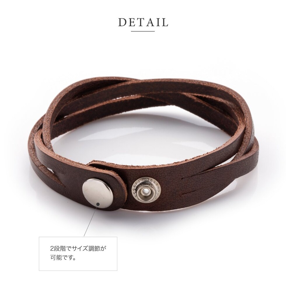 手元に存在感を与えてくれるリアルレザーブレスレット。3本を編み合わせることで、より表情豊かな印象になり、アクセント効果もアップ。2段階調節可能なスナップボタン付きで、着脱も楽ちんです。