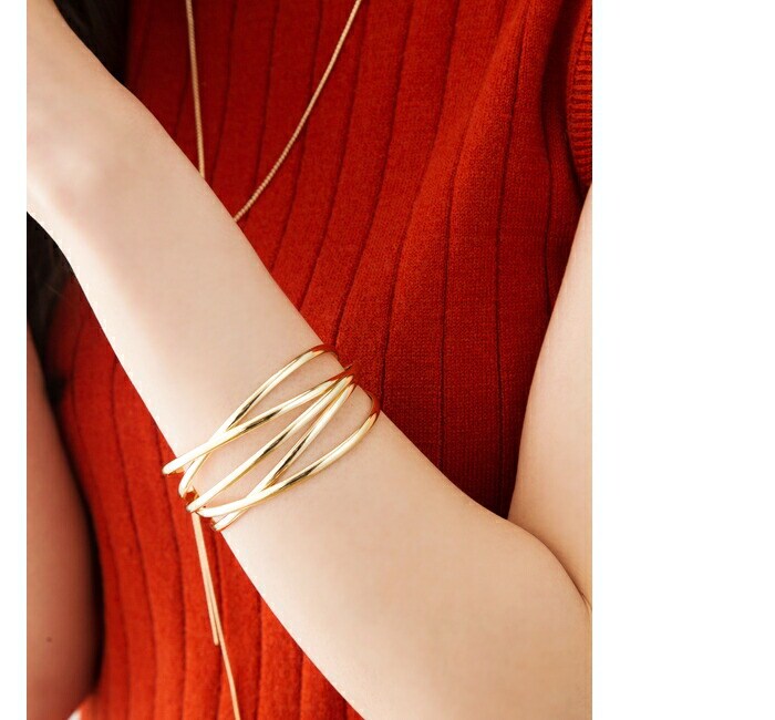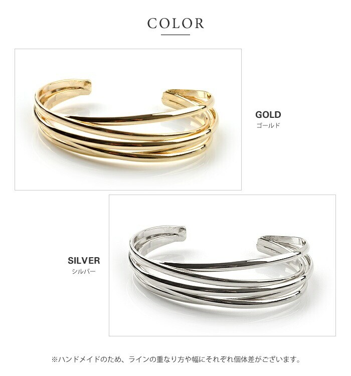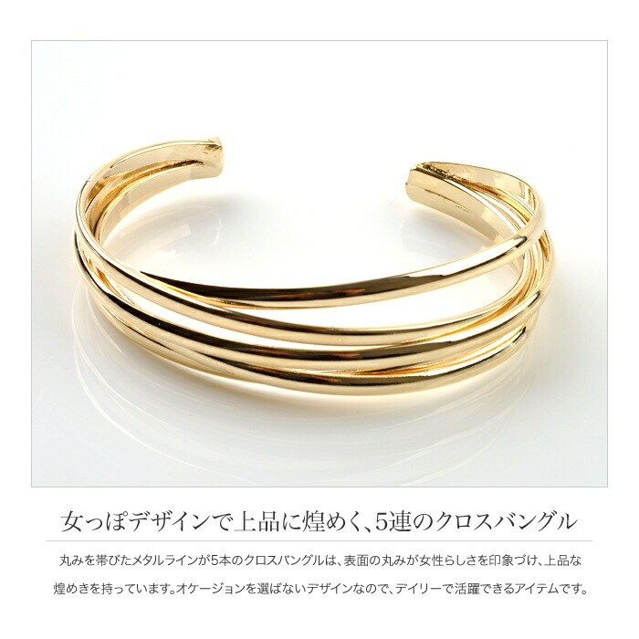 丸みを帯びたメタルラインが5本のクロスバングルは、