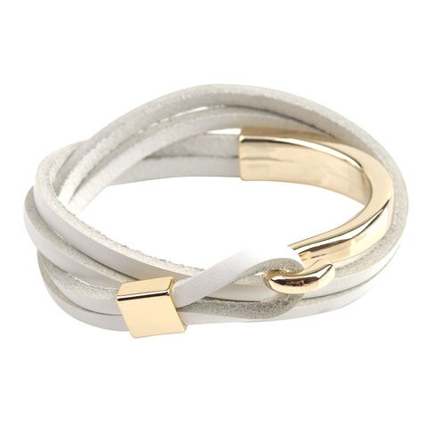 多重レザーと流れるような形のメタルフックが存在感をプラスするブレスレット。手元のアクセントにピッタリな5色展開でお好みに合わせてお選び頂けます。サッと着けるだけでこなれた印象に仕上がるひと品。