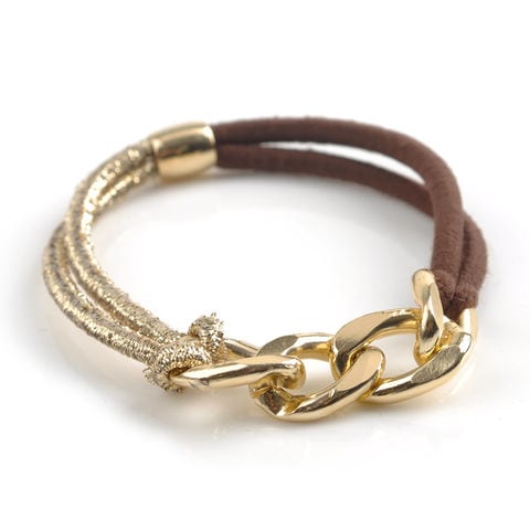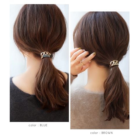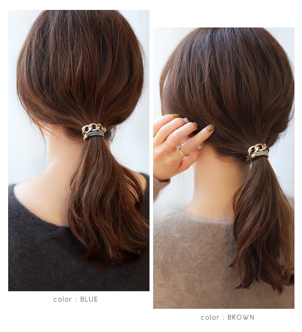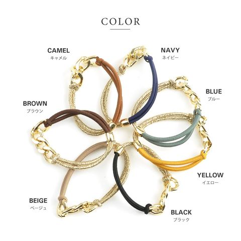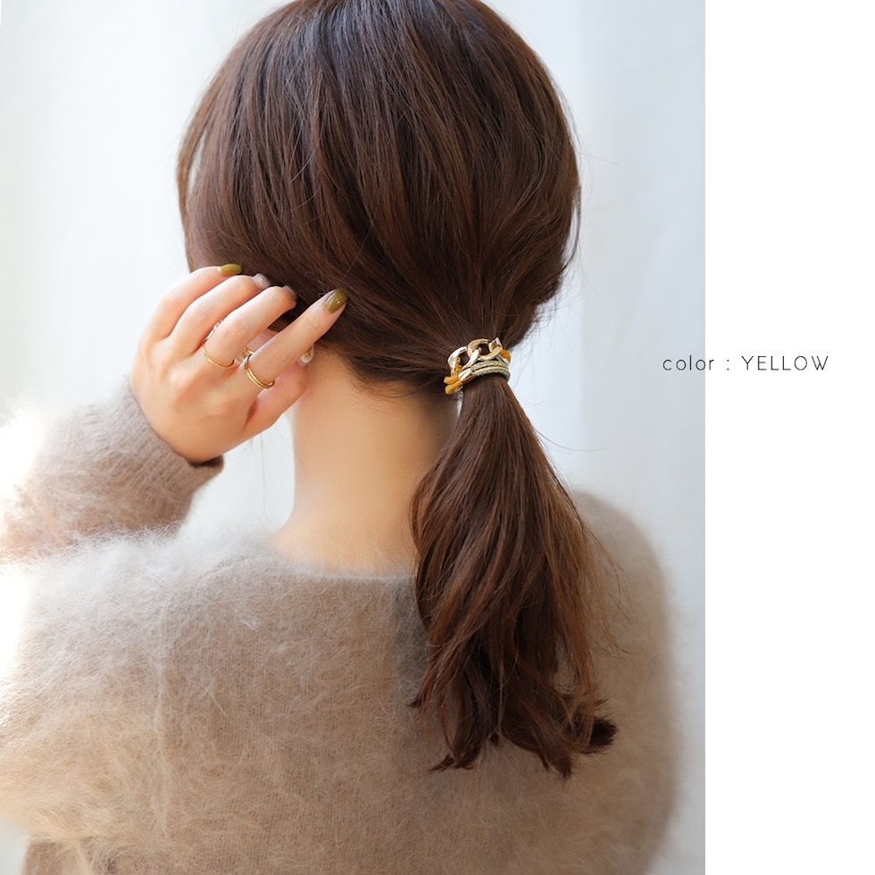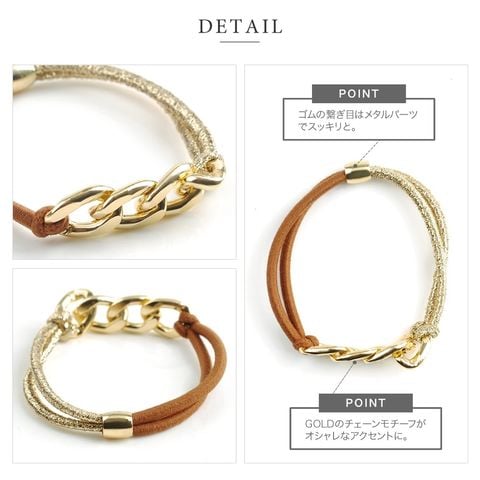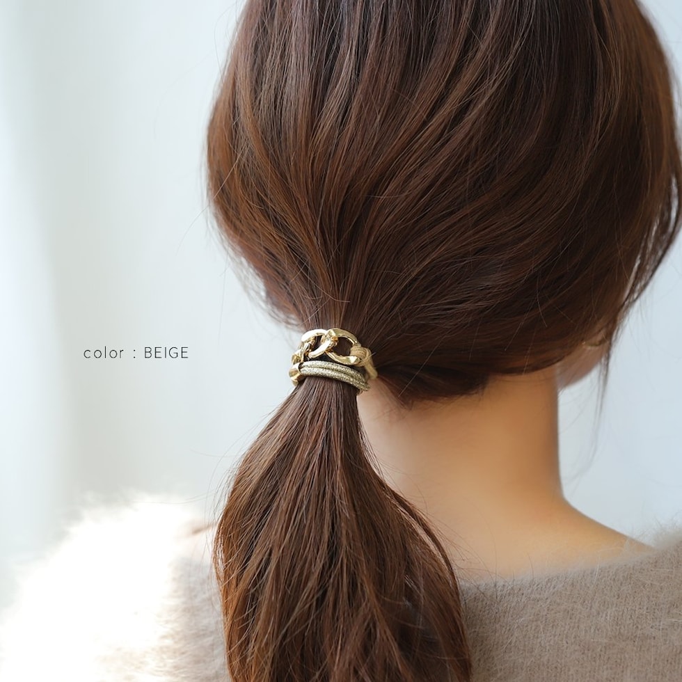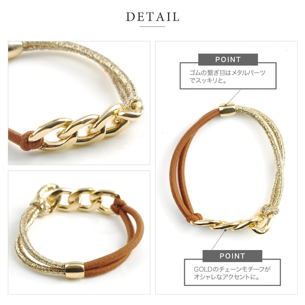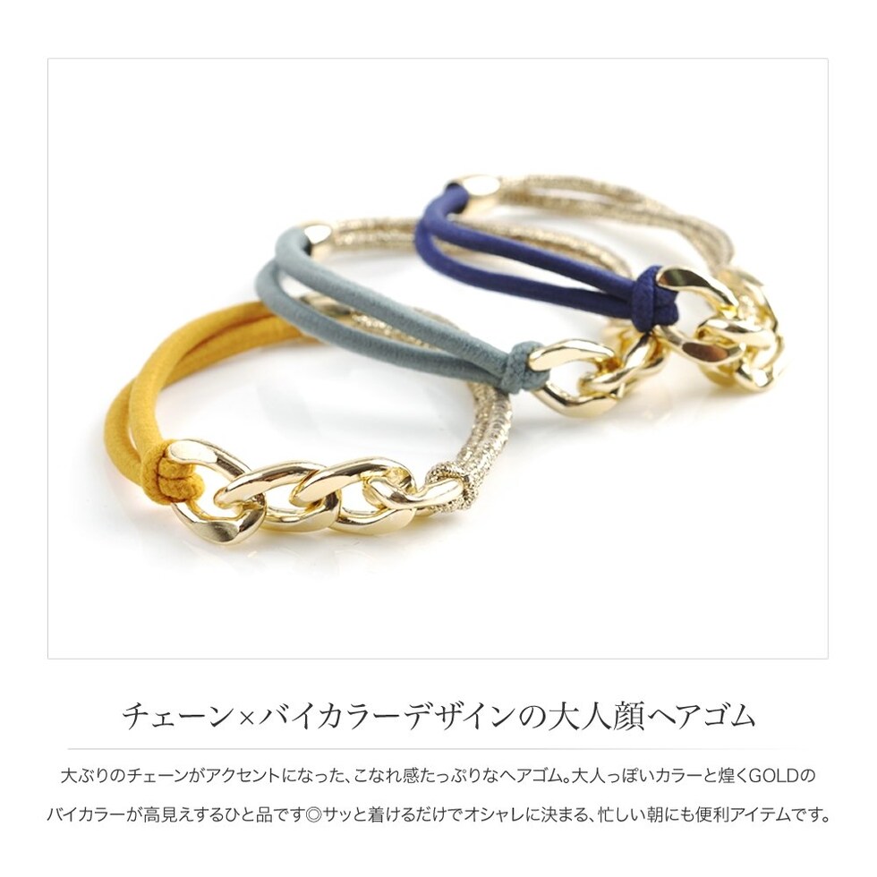 大ぶりのチェーンがアクセントになった、こなれ感たっぷりなヘアゴム。大人っぽいカラーと煌くGOLDのバイカラーが高見えするひと品です◎サッと着けるだけでオシャレに決まる、忙しい朝にも便利アイテムです。