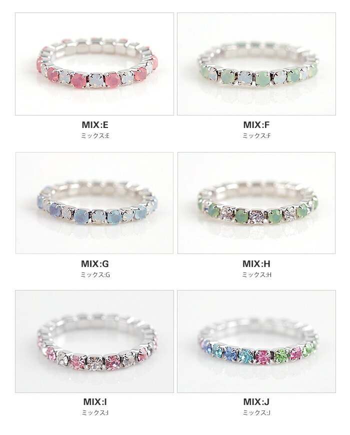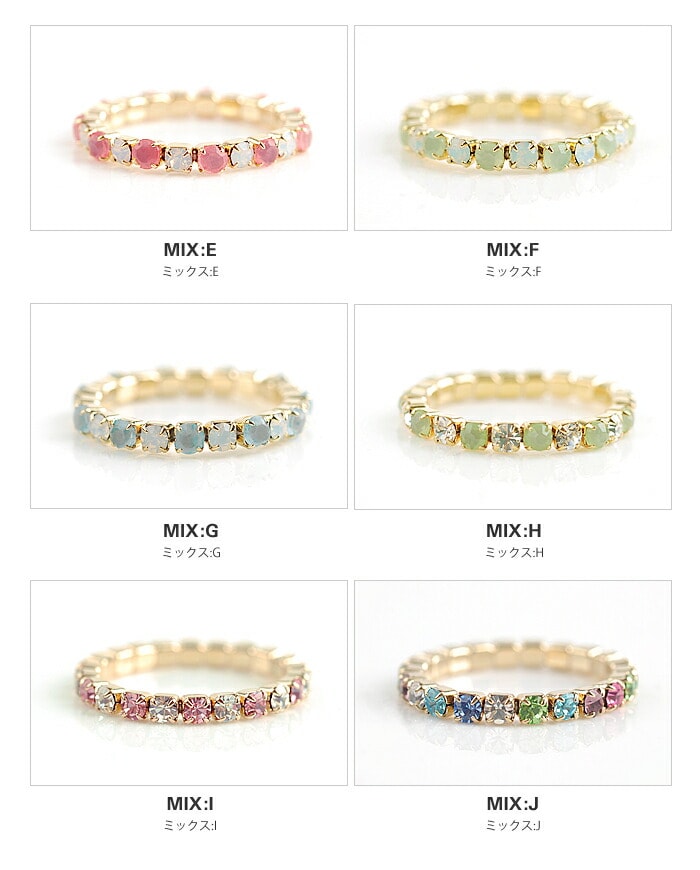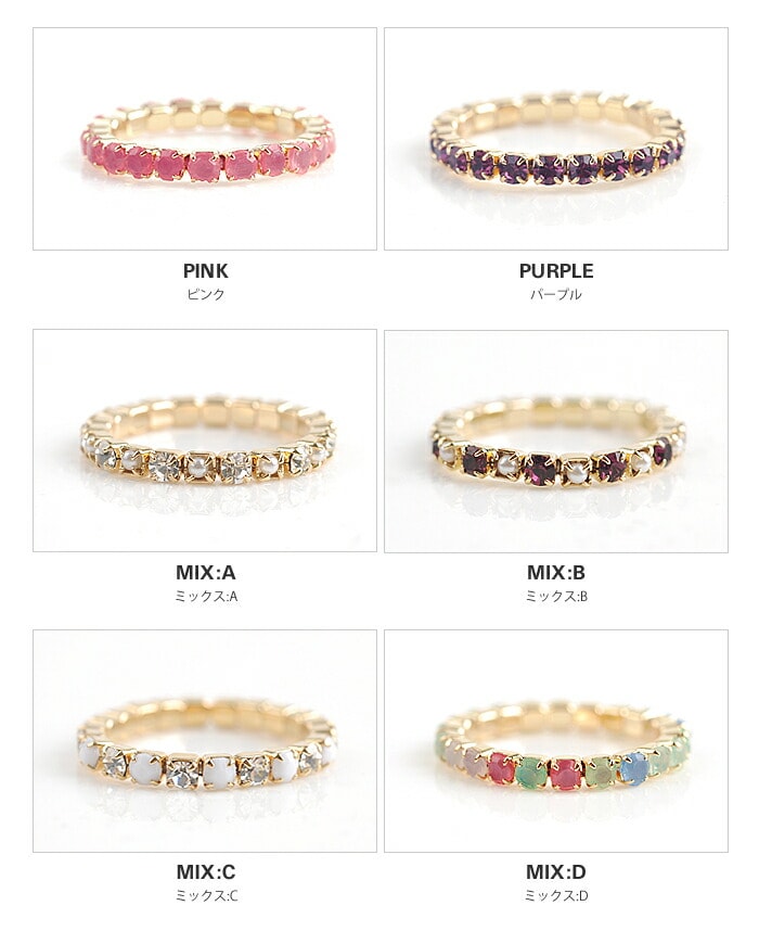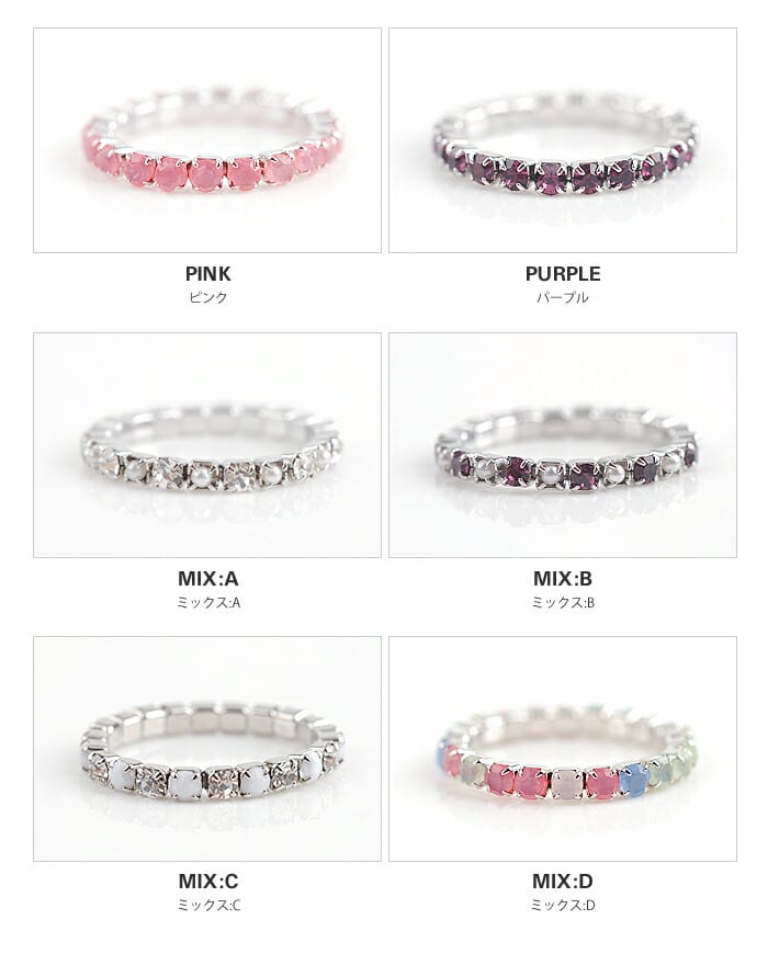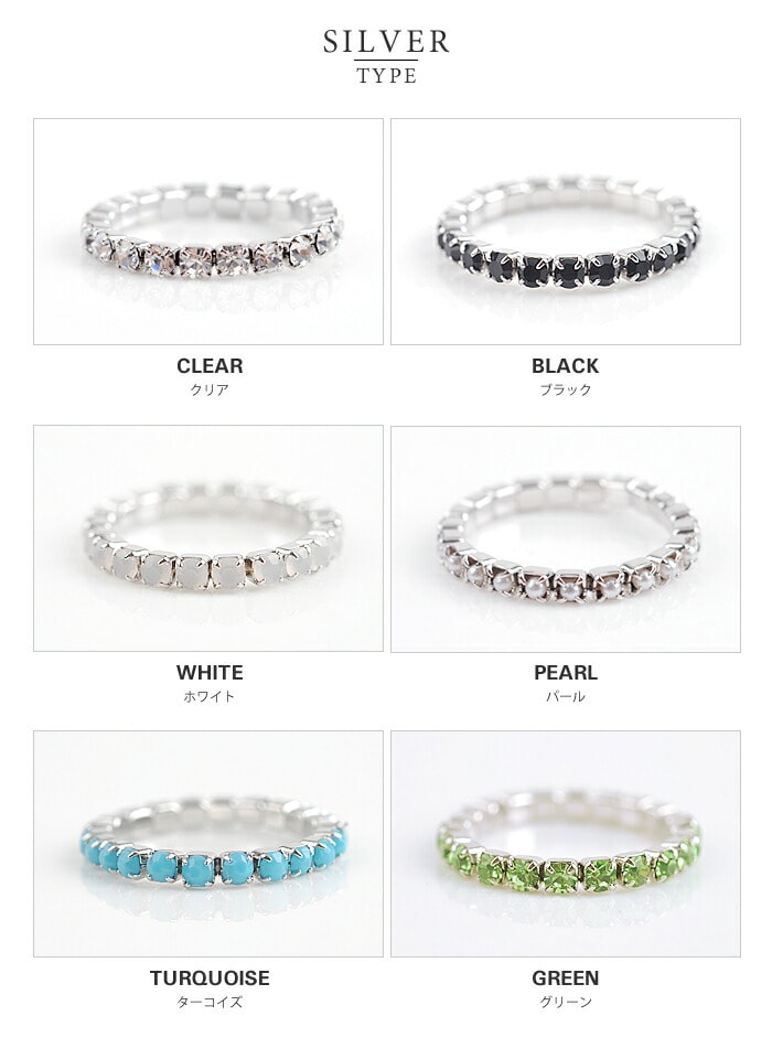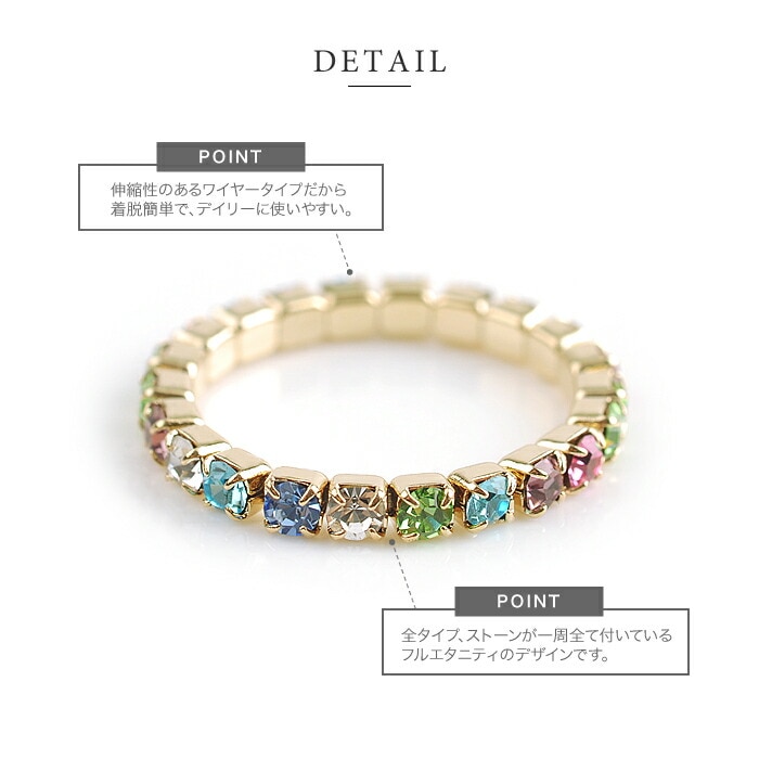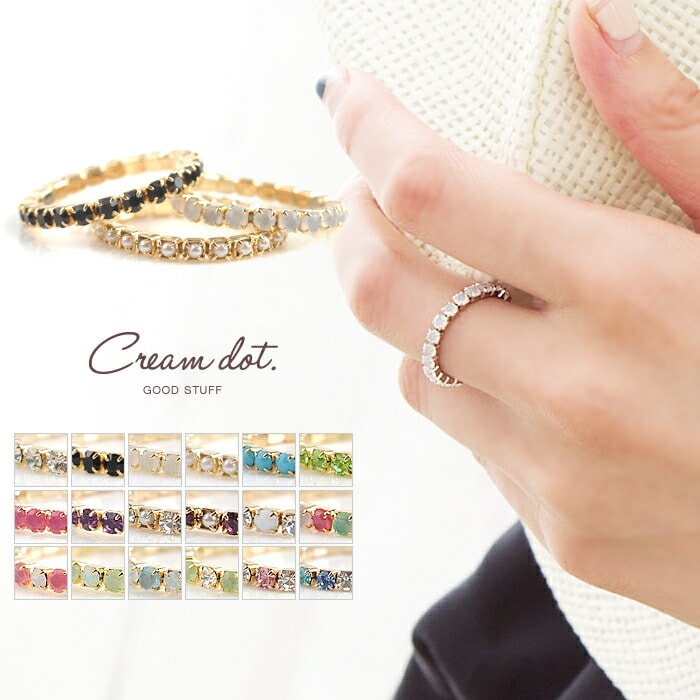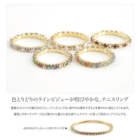 豊富なカラバリが魅力のビジューテニスリングは、鮮やかな輝きで手もとを華やかに演出してくれます。