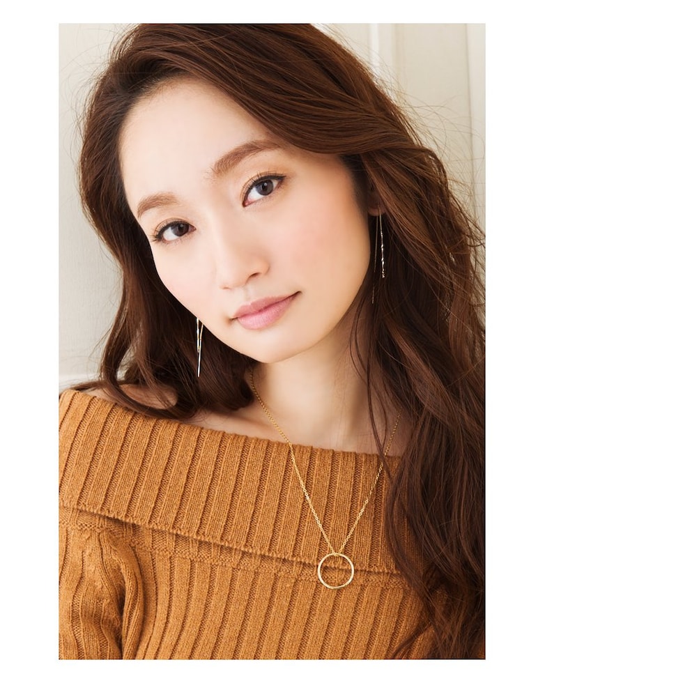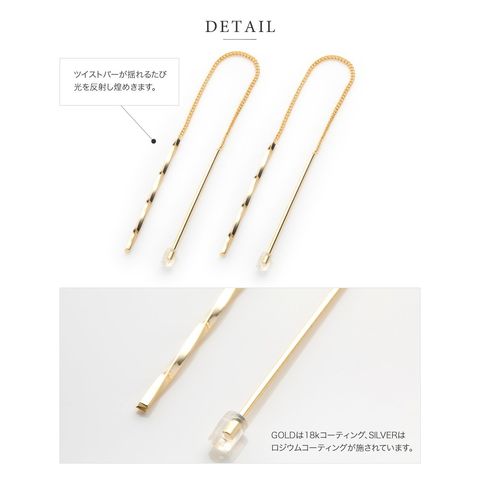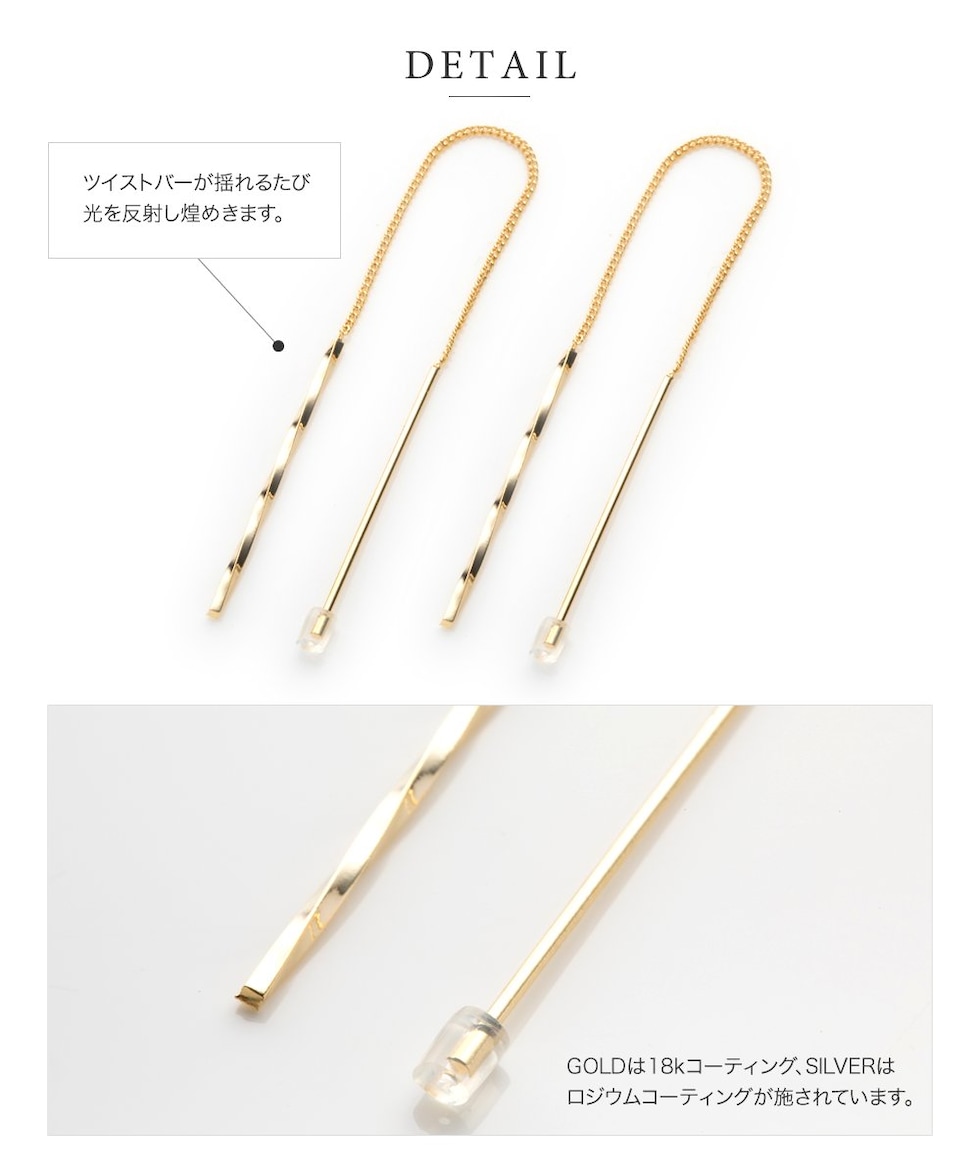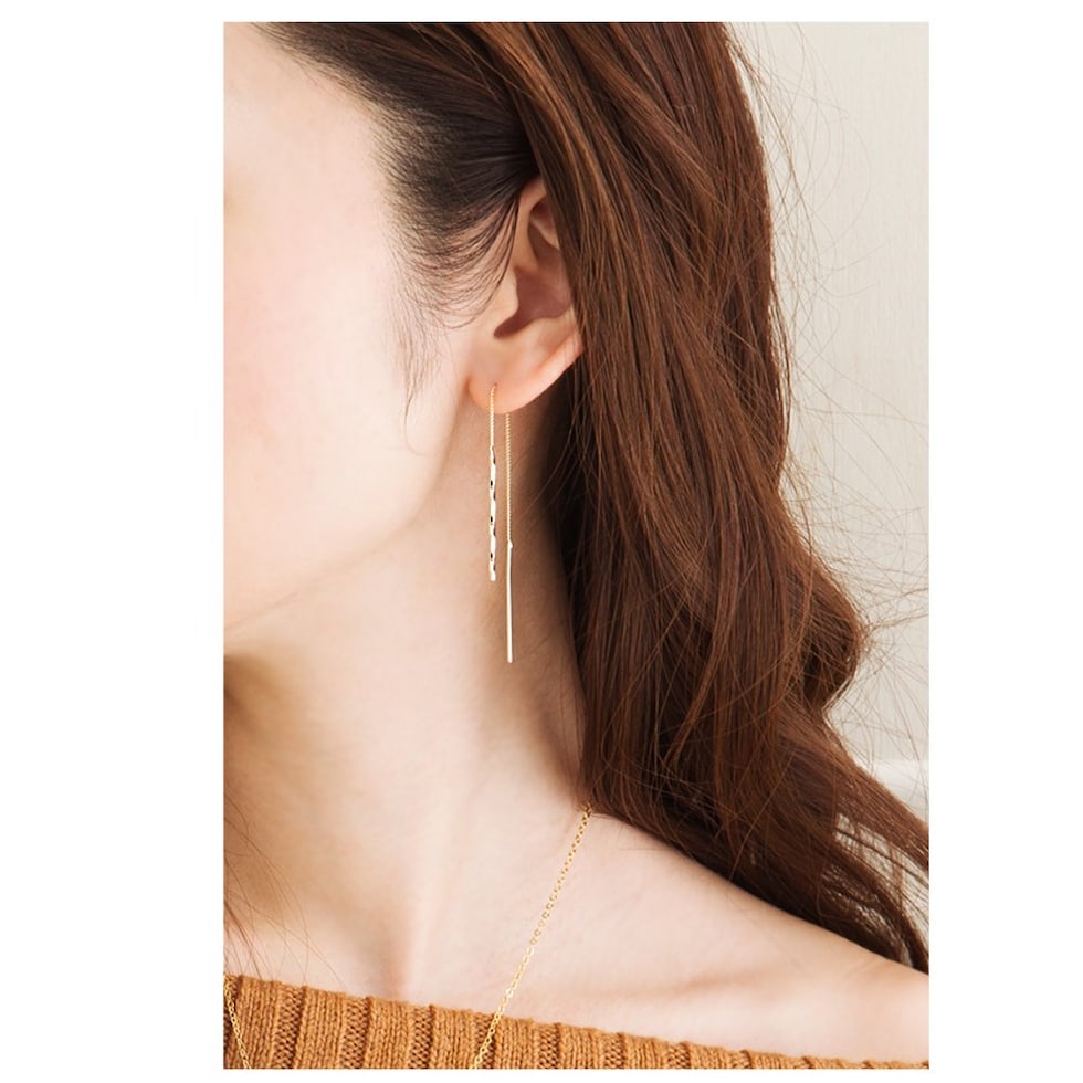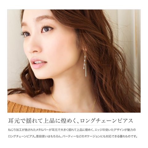 ねじり加工が施されたメタルバーが耳元で大きく揺れて上品に煌めく、