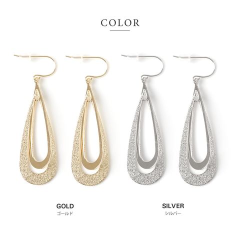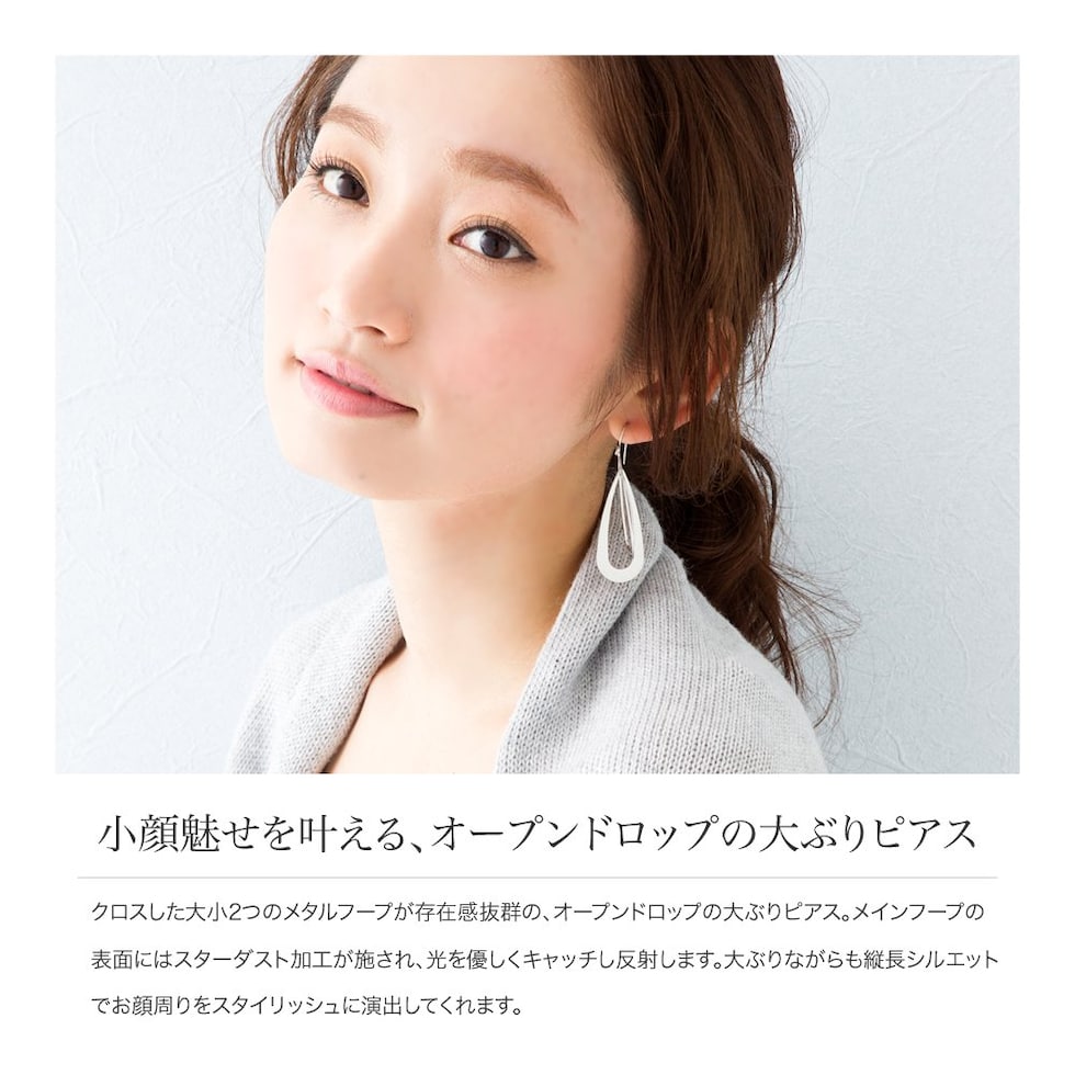 クロスした大小2つのメタルフープが存在感抜群の、オープンドロップの大ぶりピアス。メインフープの表面にはスターダスト加工が施され、光を優しくキャッチし反射します。大ぶりながらも縦長シルエットでお顔周りをスタイリッシュに演出してくれます。