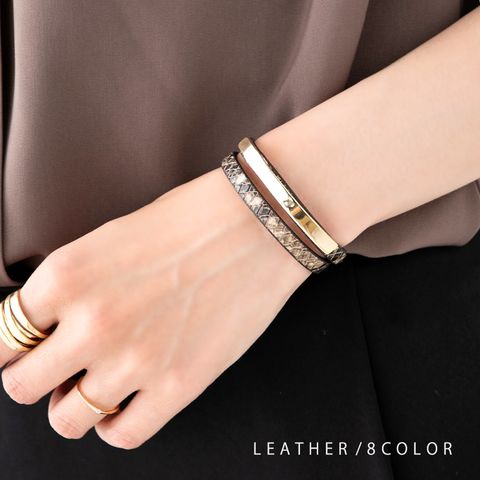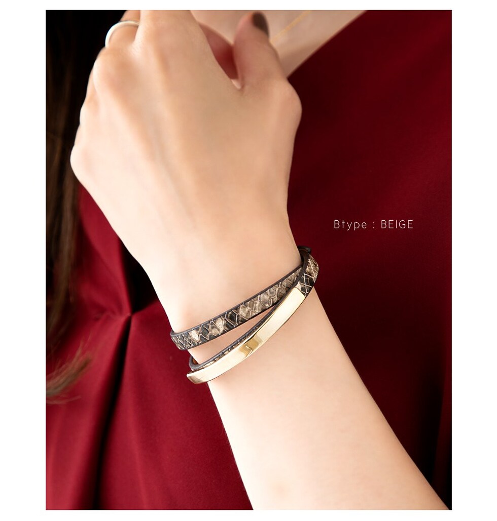ブレスレット 金属アレルギー ニッケルフリー レディース リアルレザー 本革 PUレザー 合皮 メタル 2連 重ねづけ パイソン cream dot ゆうパケット [A:キャメル_フリーサイズ]