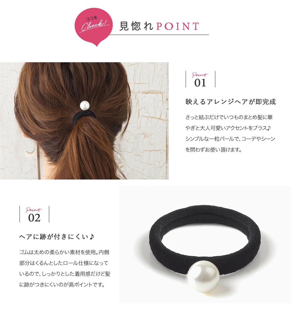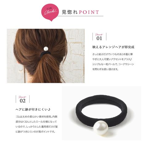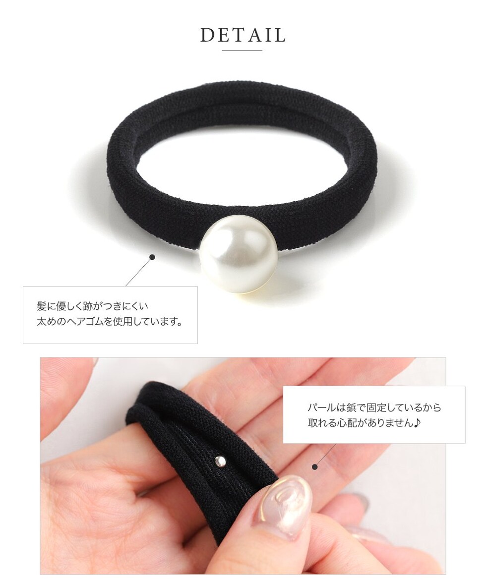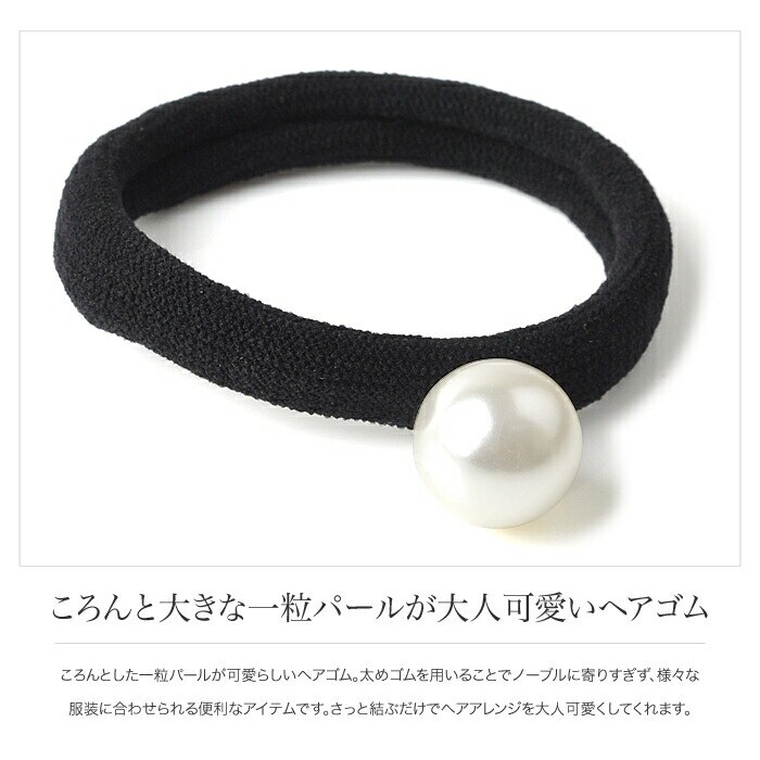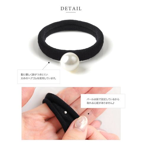 ころんとした一粒パールが可愛らしいヘアゴム。太めゴムを用いることでノーブルに寄りすぎず、様々な服装に合わせられる便利なアイテムです。さっと結ぶだけでヘアアレンジを大人可愛くしてくれます。