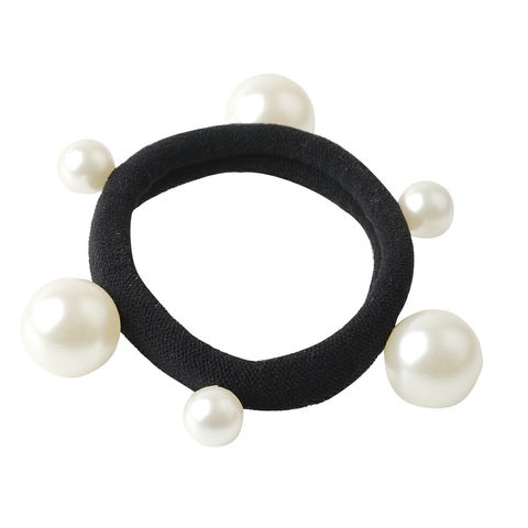 大きさの違うパールを並べたヘアゴム。太めゴムを用いることでノーブルに寄りすぎず、様々な服装に合わせられる便利なアイテムです。まとめ髪に華やかさを添えてくれるから、さっと結ぶだけでお洒落見え。