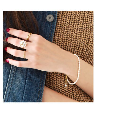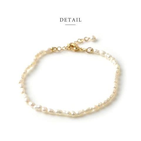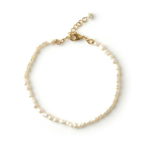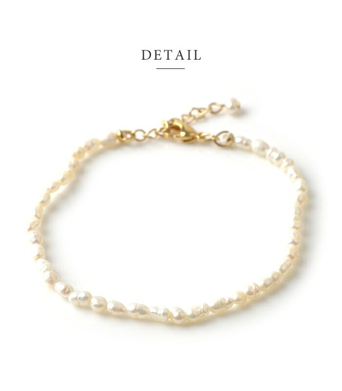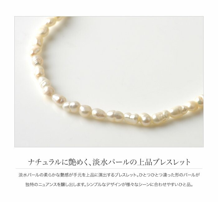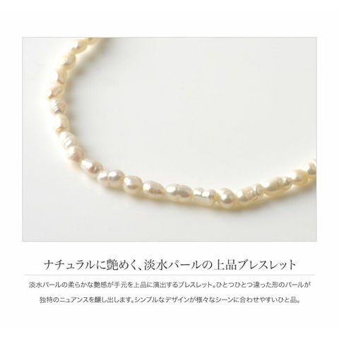 淡水パールの柔らかな艶感が手元を上品に演出するブレスレット。ひとつひとつ違った形のパールが独特のニュアンスを醸し出します。シンプルなデザインが様々なシーンに合わせやすいひと品。