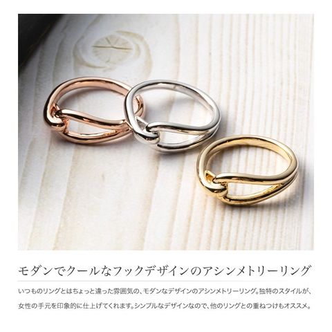 いつものリングとはちょっと違った雰囲気の、モダンなデザインのアシンメトリーリング。独特のスタイルが、女性の手元を印象的に仕上げてくれます。シンプルなデザインなので、他のリングとの重ねつけもオススメ。