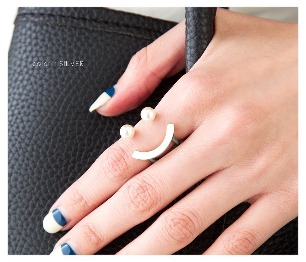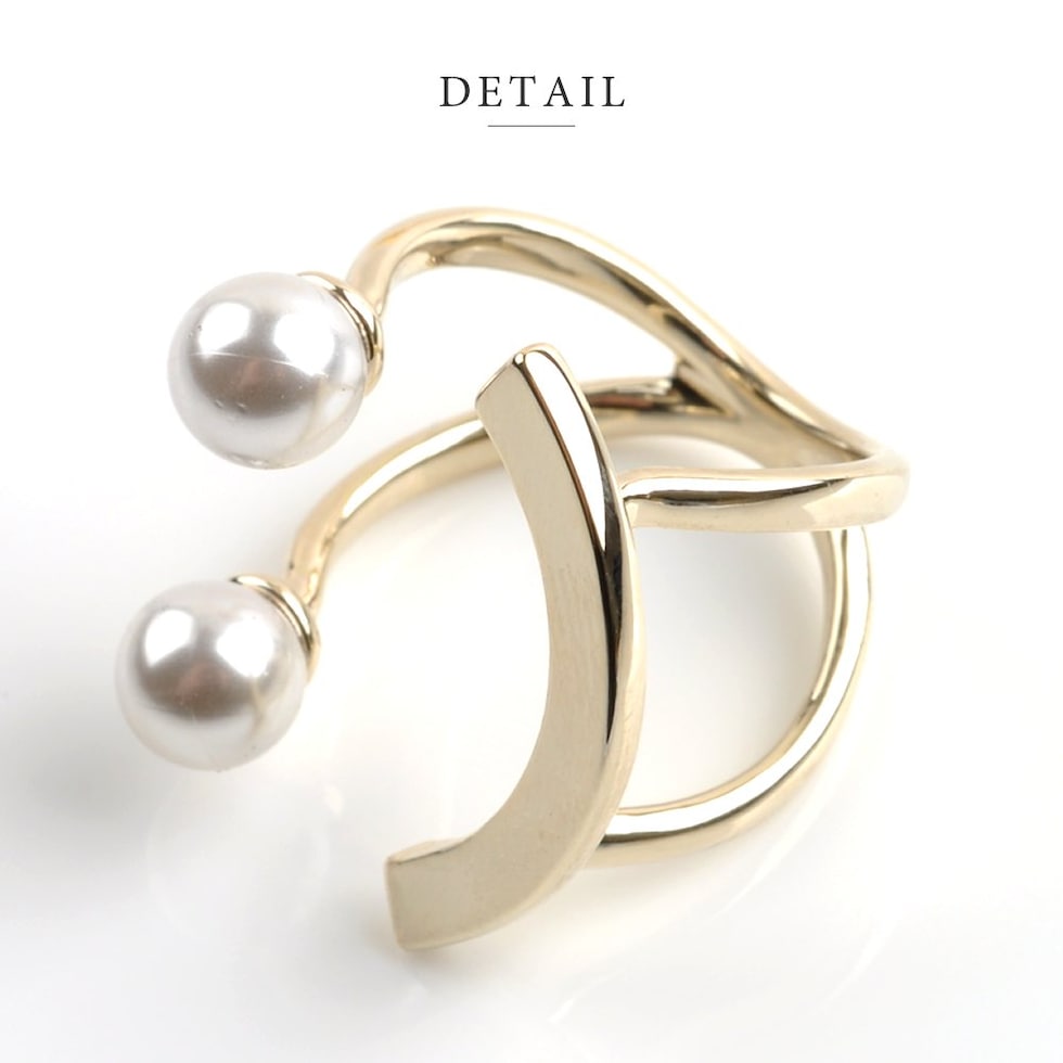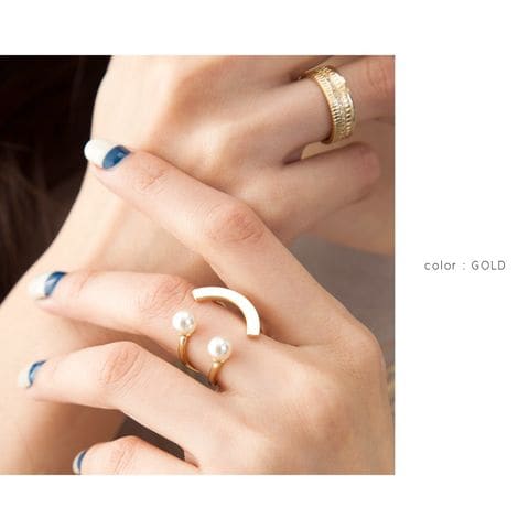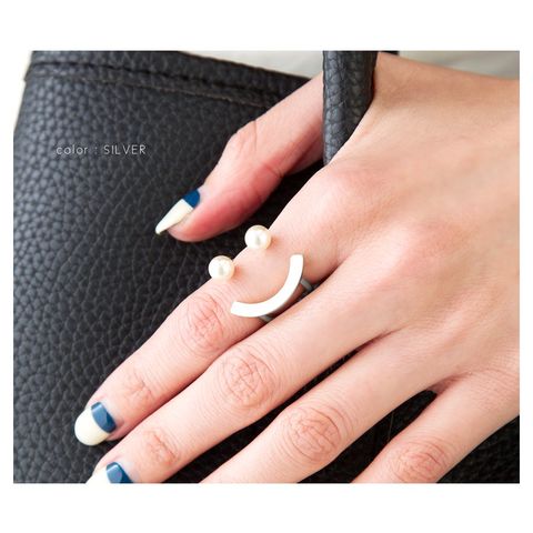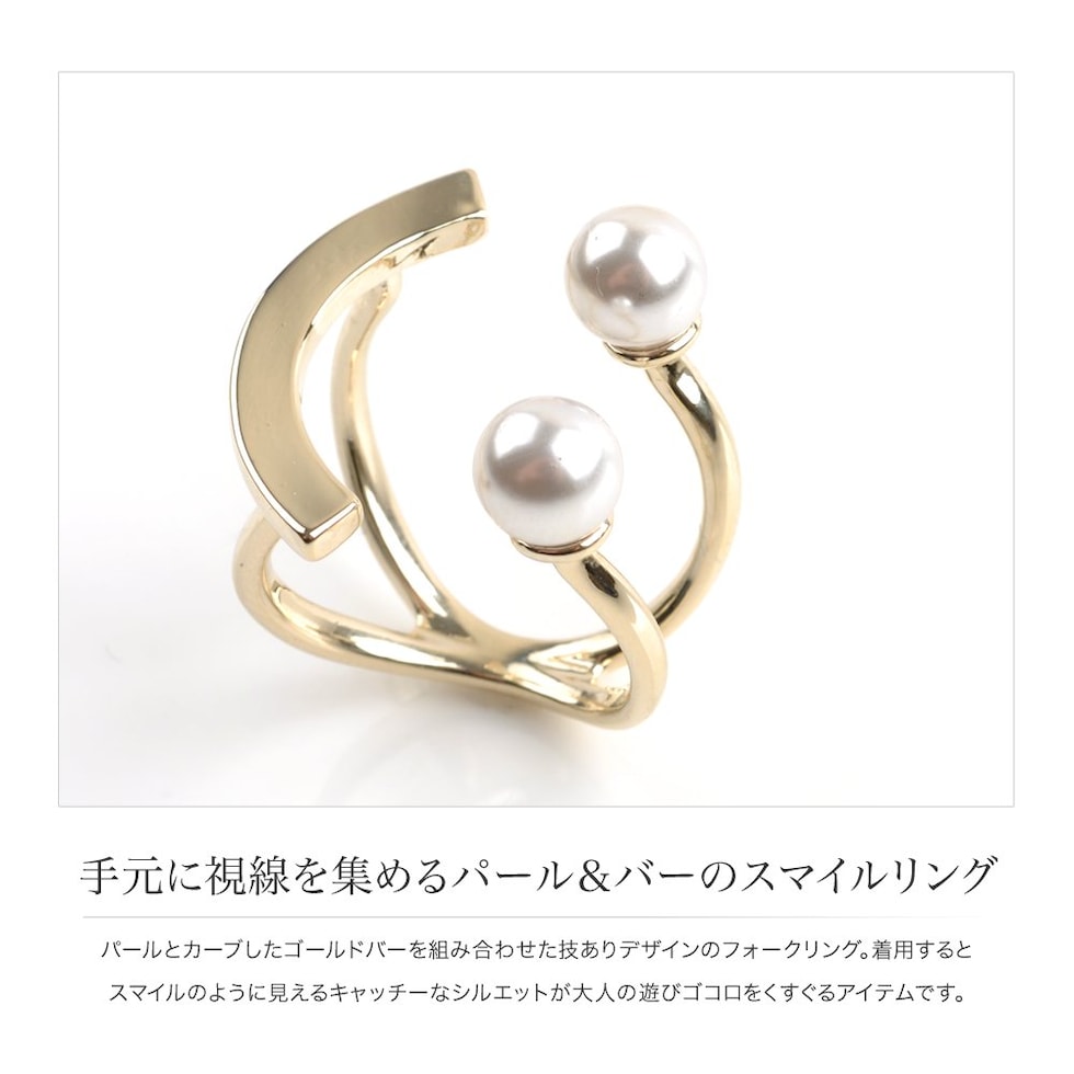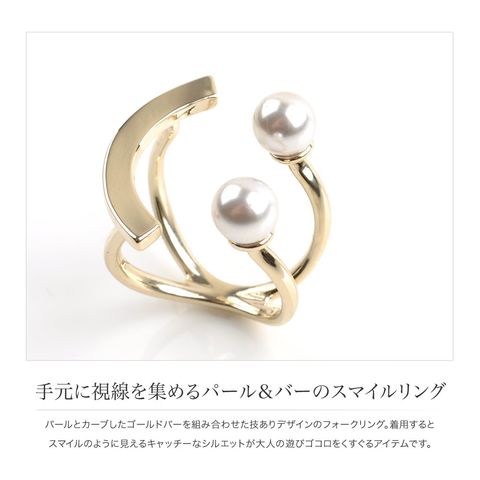 パールとカーブしたゴールドバーを組み合わせた技ありデザインのフォークリング。着用するとスマイルのように見えるキャッチーなシルエットが大人の遊びゴコロをくすぐるアイテムです。