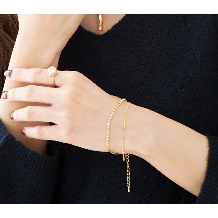 ラインビジューとシンプルチェーンの2連ブレスレット。