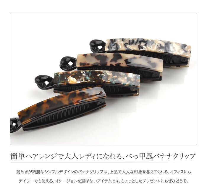 艶めきが綺麗なシンプルデザインのバナナクリップは、上品で大人な印象を与えてくれる、オフィスにもデイリーでも使える、オケージョンを選ばないアイテムです。ちょっとしたプレゼントにもぜひどうぞ。