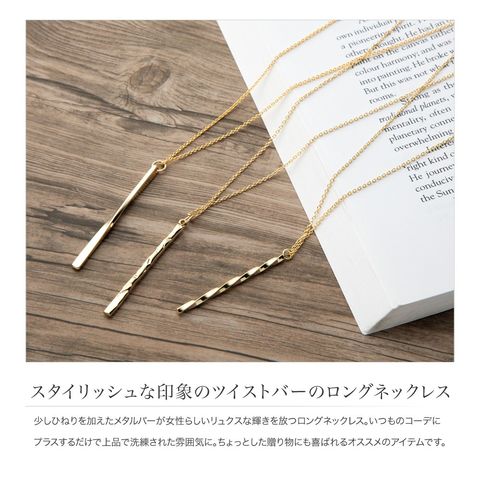 少しひねりを加えたメタルバーが女性らしいリュクスな輝きを放つロングネックレス。いつものコーデにプラスするだけで上品で洗練された雰囲気に。ちょっとした贈り物にも喜ばれるオススメのアイテムです。