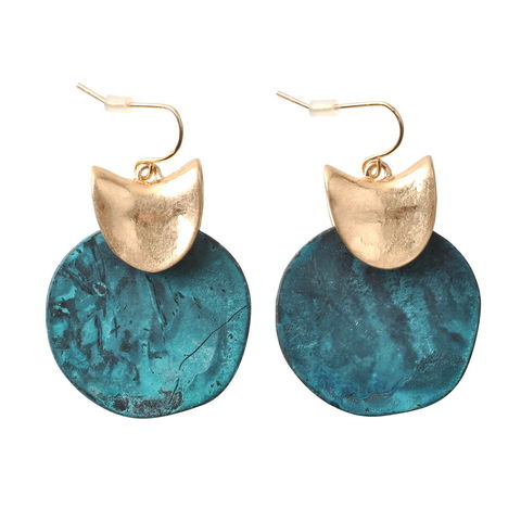 ニュアンスのあるメタルプレートを、ボヘミアン調ターコイズカラーで染めたピアス/イヤリング。いびつなプレートと深みのあるブルーが抜け感のある大人の女性を演出。お顔周りをパッと華やかにしてくれます。