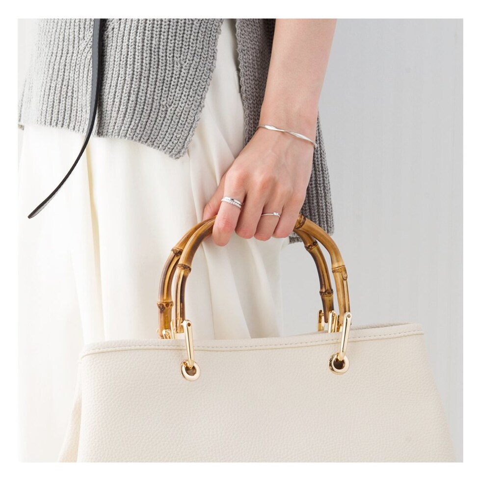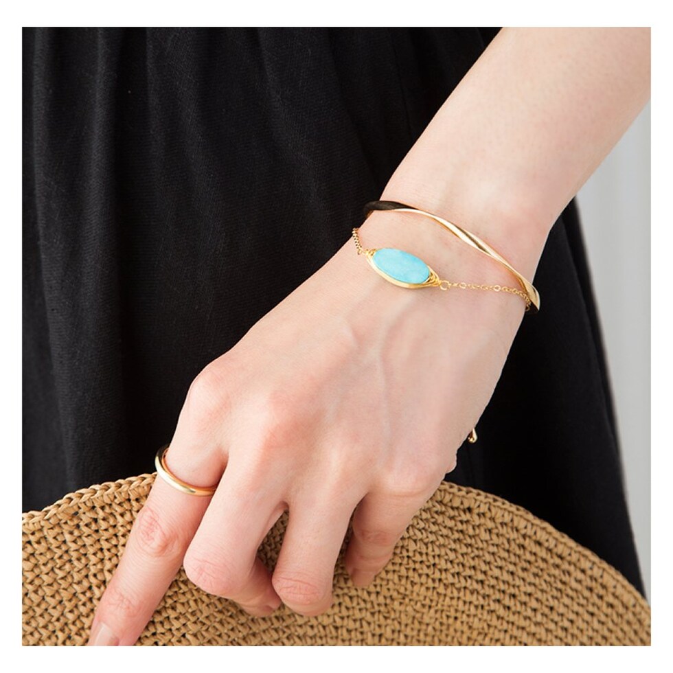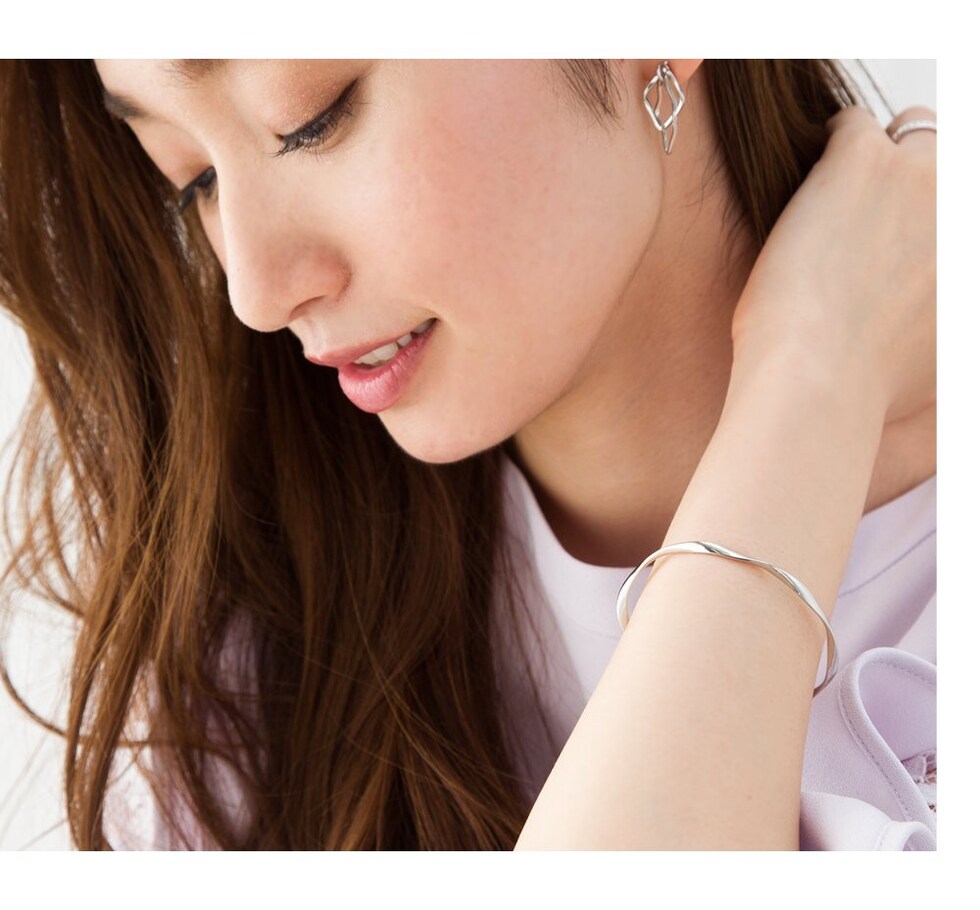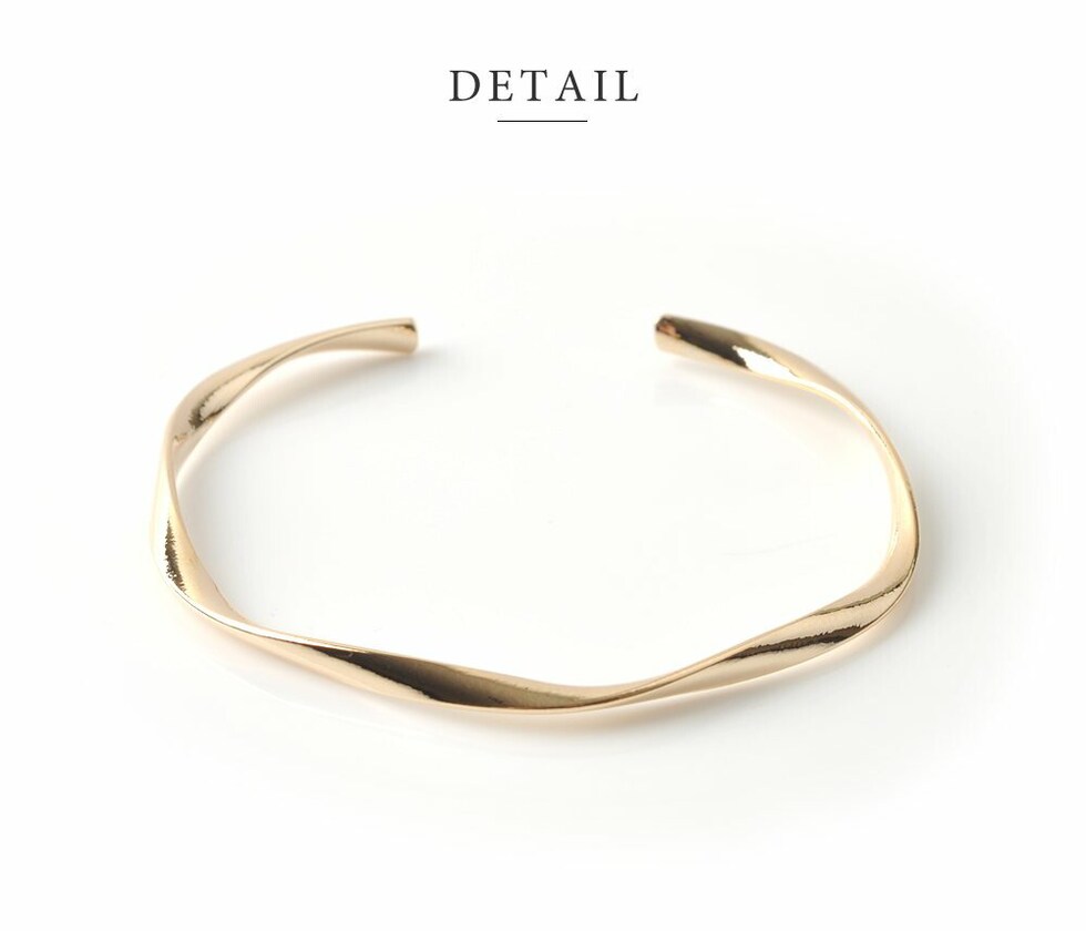 緩やかにツイストされ、波打つラインが印象的なメタルバングル。華奢ながらさりげない存在感を放ちます。どんなコーデにも映えるシンプルデザインなので、お手持ちのブレスレットと重ね付けを楽しんでも◎