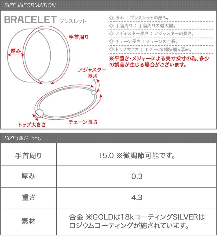 手首周り:15.0cm ※オープンタイプのため若干の調節可