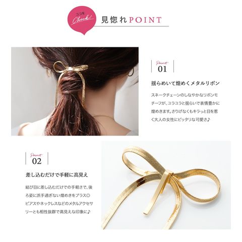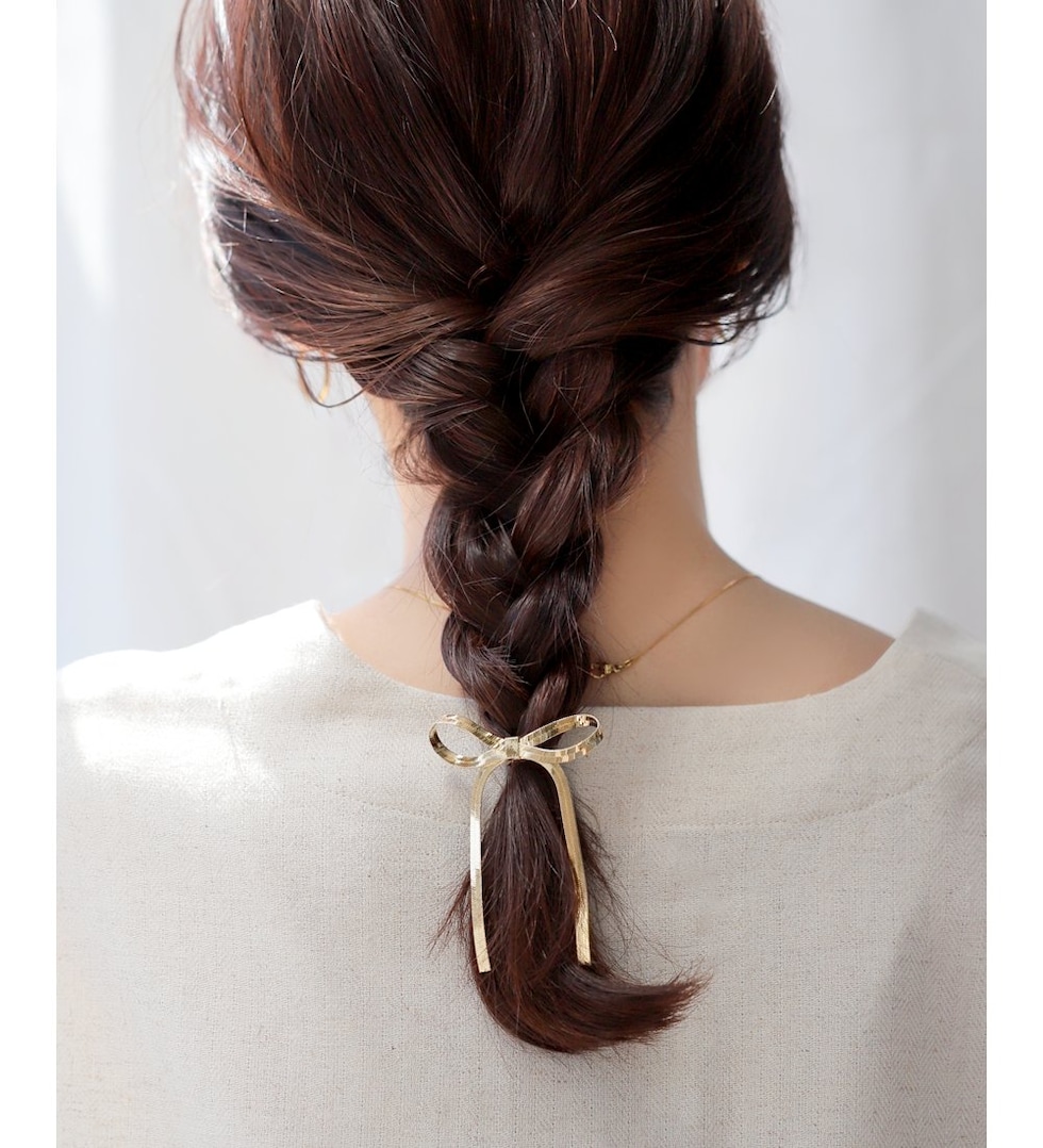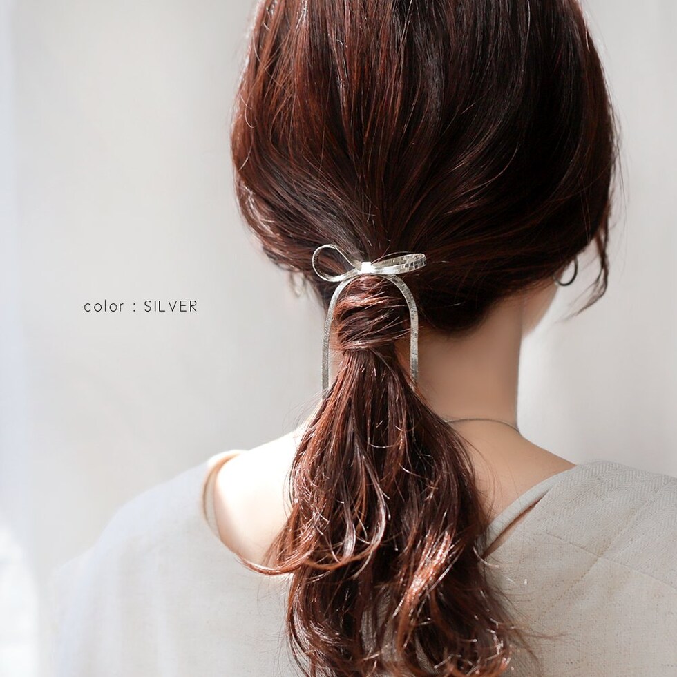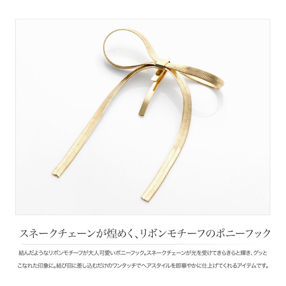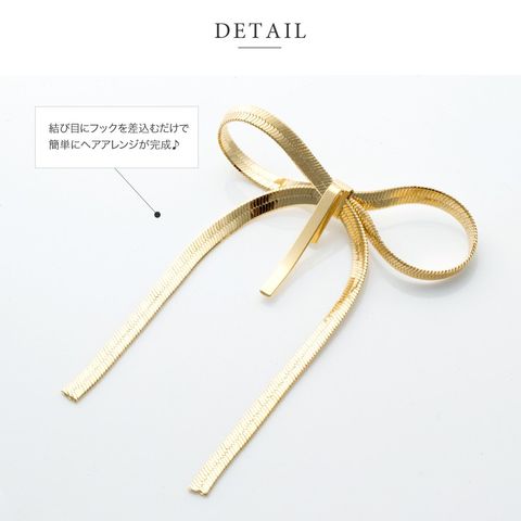 結んだようなリボンモチーフが大人可愛いポニーフック。スネークチェーンが光を受けてきらきらと輝き、グッとこなれた印象に。結び目に差し込むだけのワンタッチでヘアスタイルを即華やかに仕上げてくれるアイテムです。