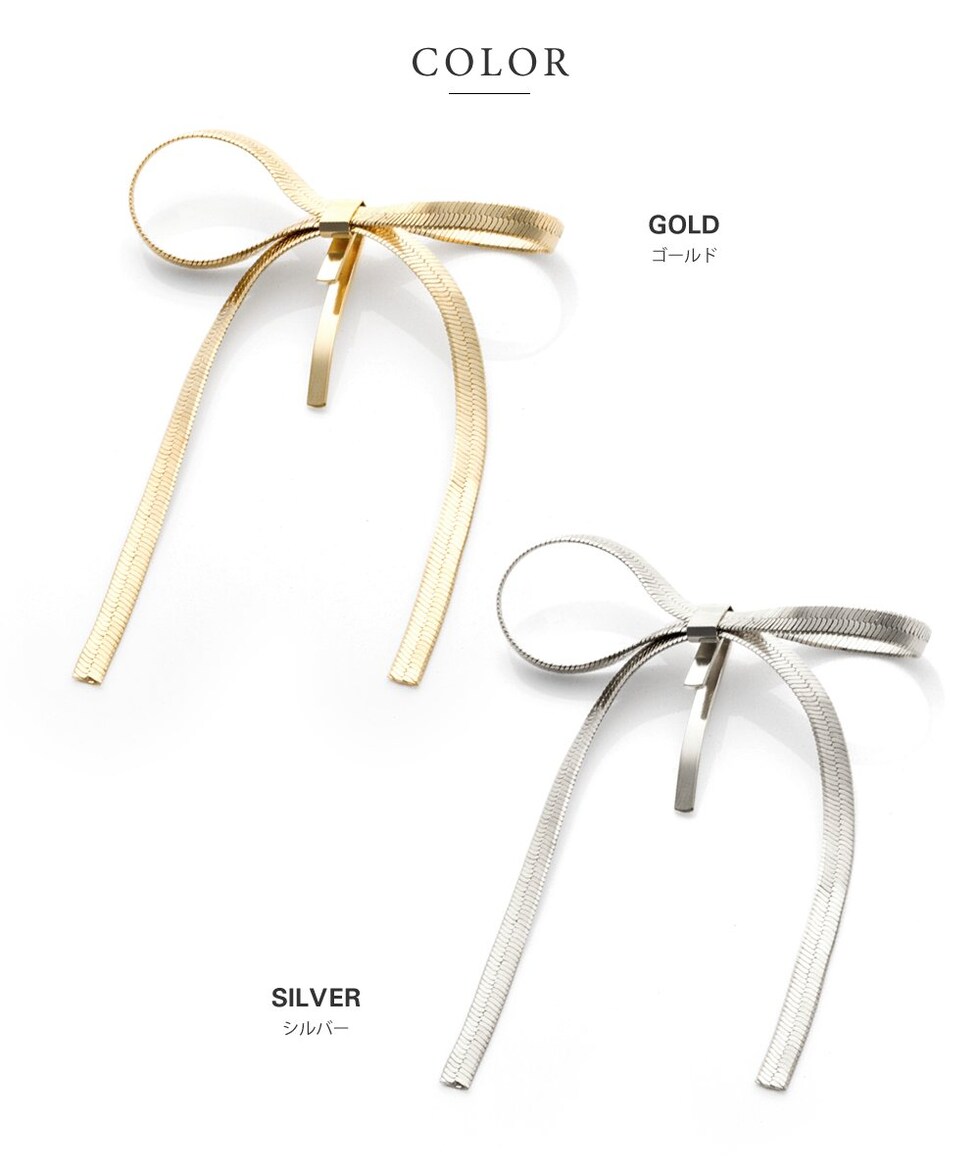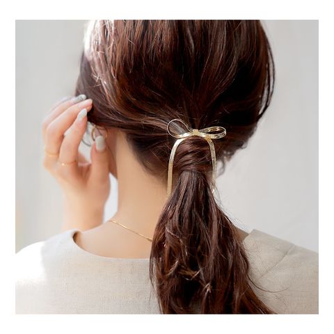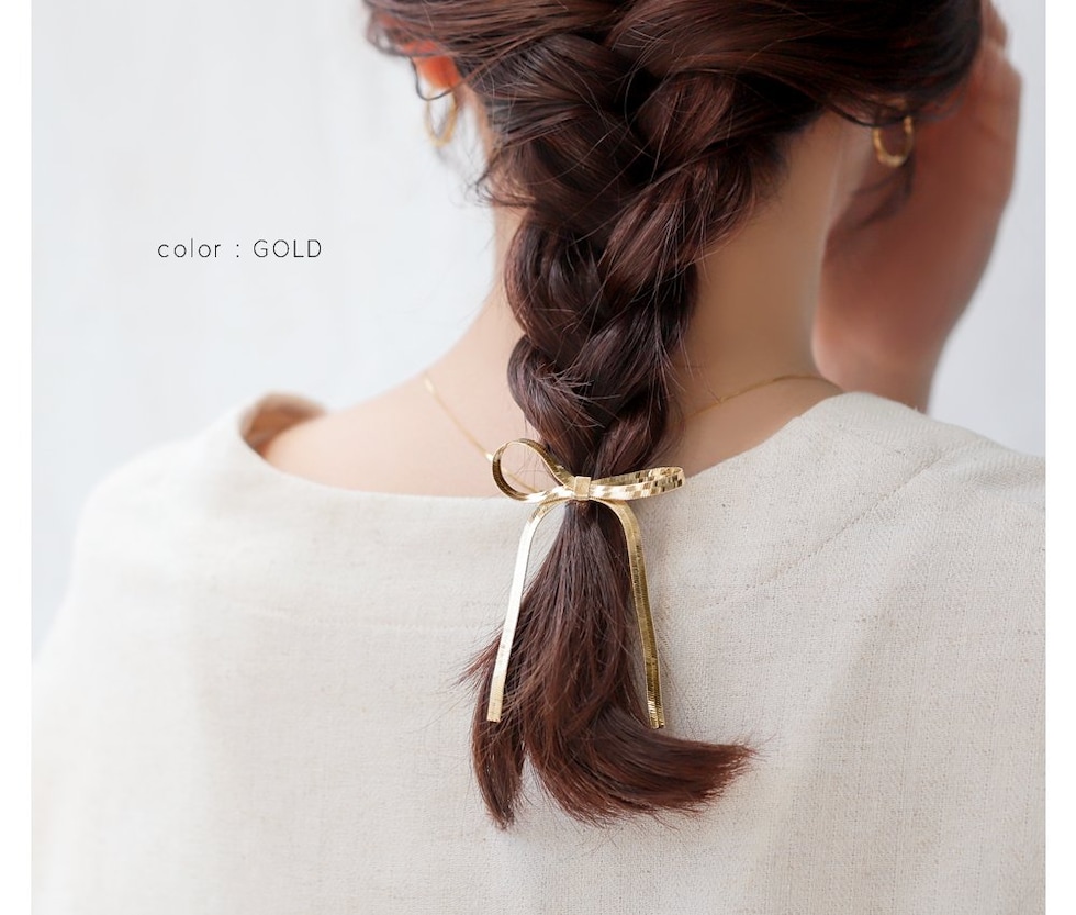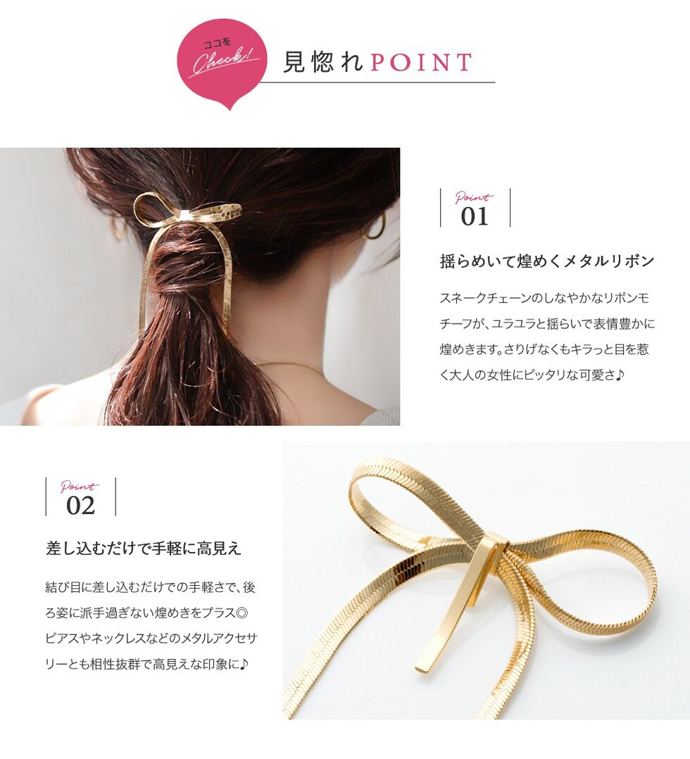 結んだようなリボンモチーフが大人可愛いポニーフック。スネークチェーンが光を受けてきらきらと輝き、グッとこなれた印象に。結び目に差し込むだけのワンタッチでヘアスタイルを即華やかに仕上げてくれるアイテムです。