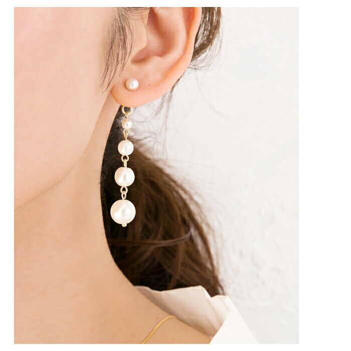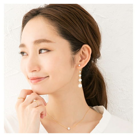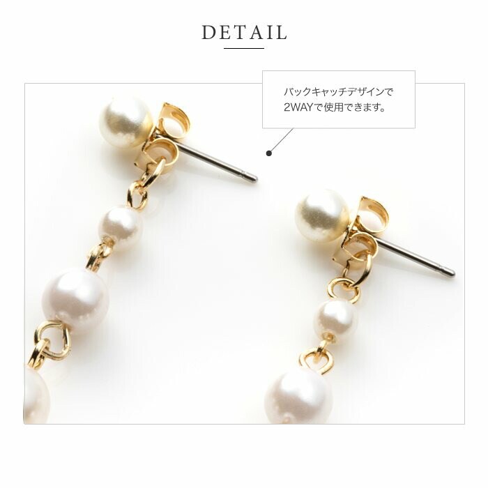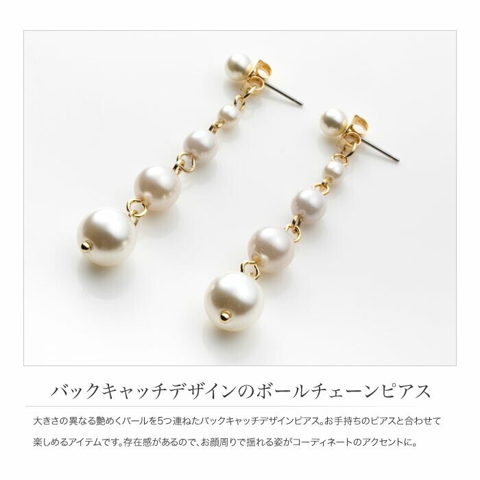 大きさの異なる艶めくパールを5つ連ねたバックキャッチデザインピアス。