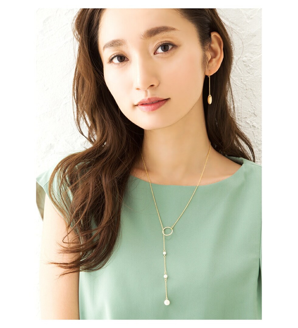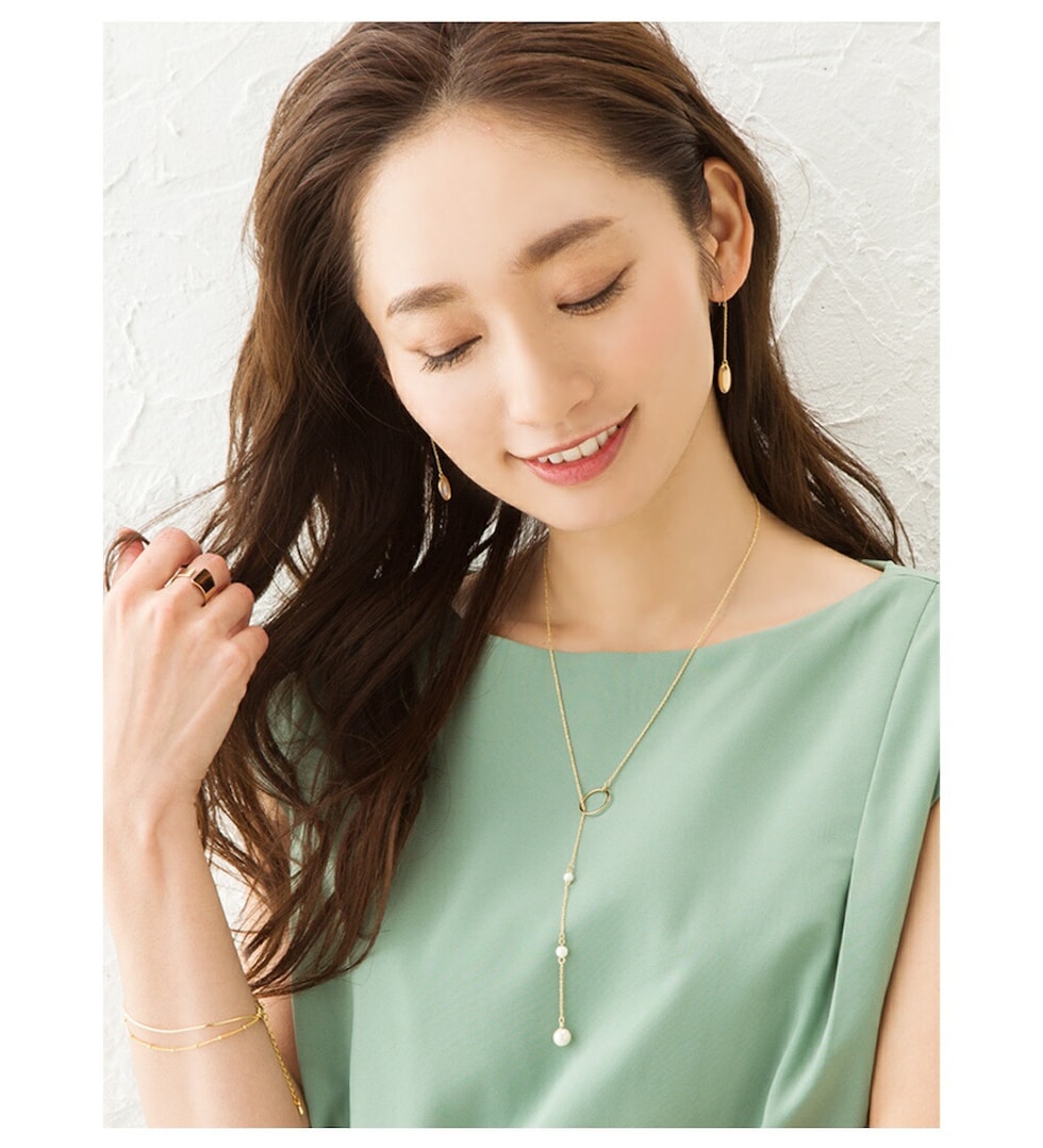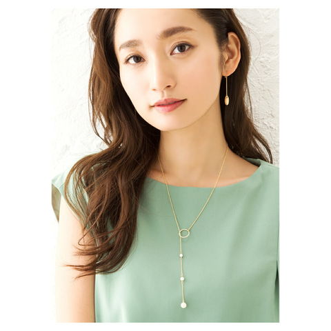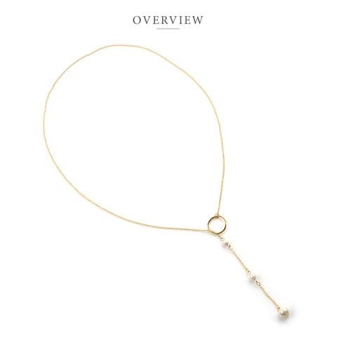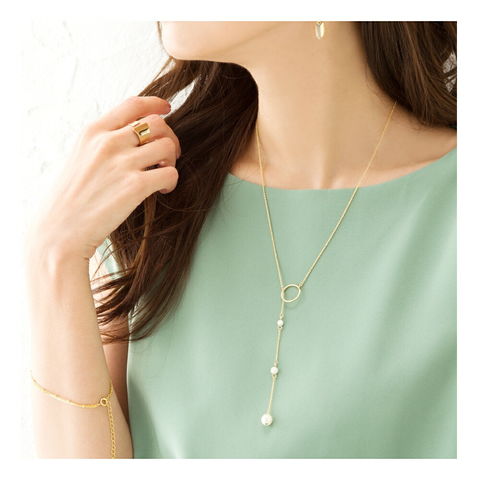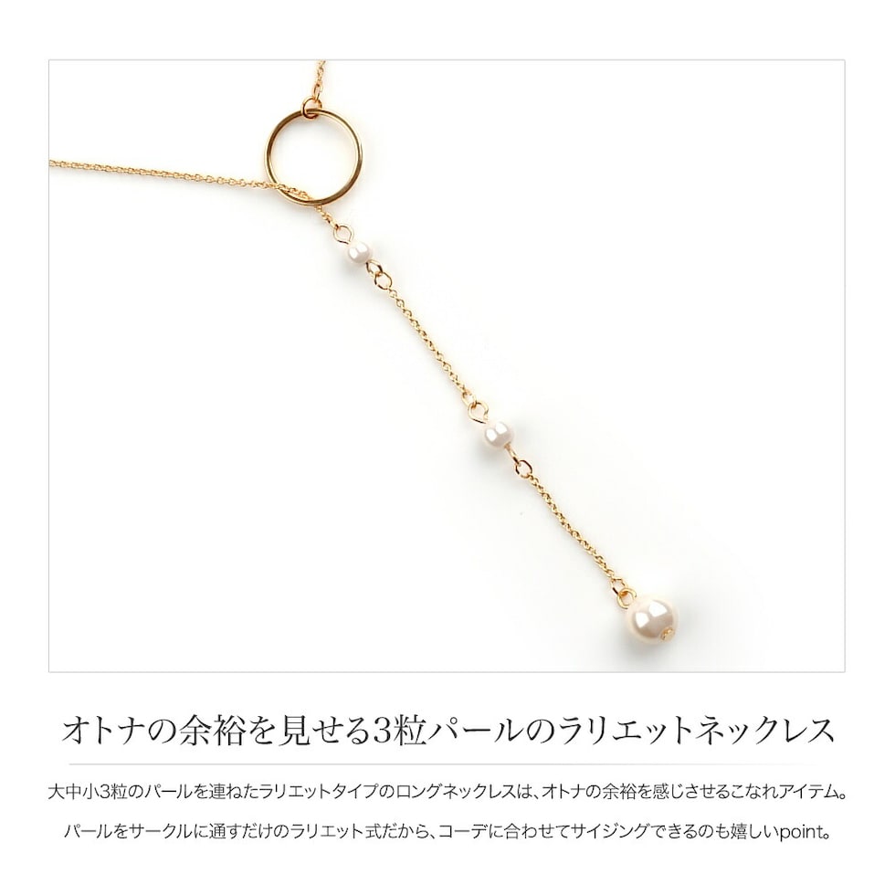 大中小3粒のパールを連ねたラリエットタイプのロングネックレスは、