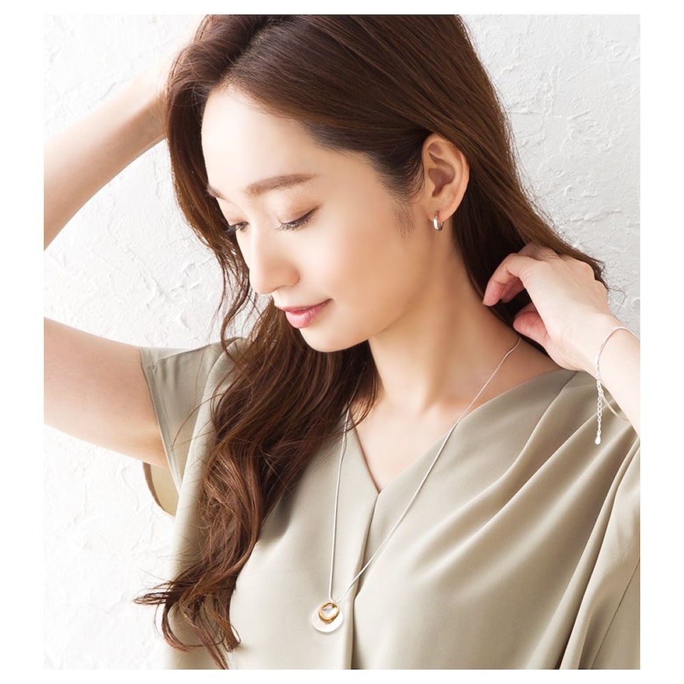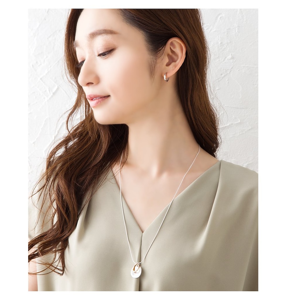 字金プレートにゆがみを加えたサークルモチーフが重なったロングネックレス。