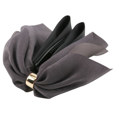 しっとりとした艶感のある起毛素材と、グログラン生地の2種類のリボンが重なる大きめバナナクリップ。