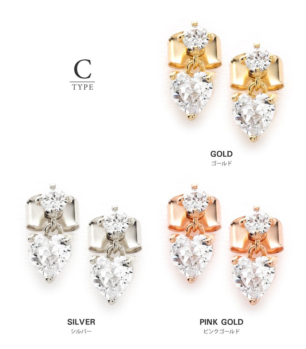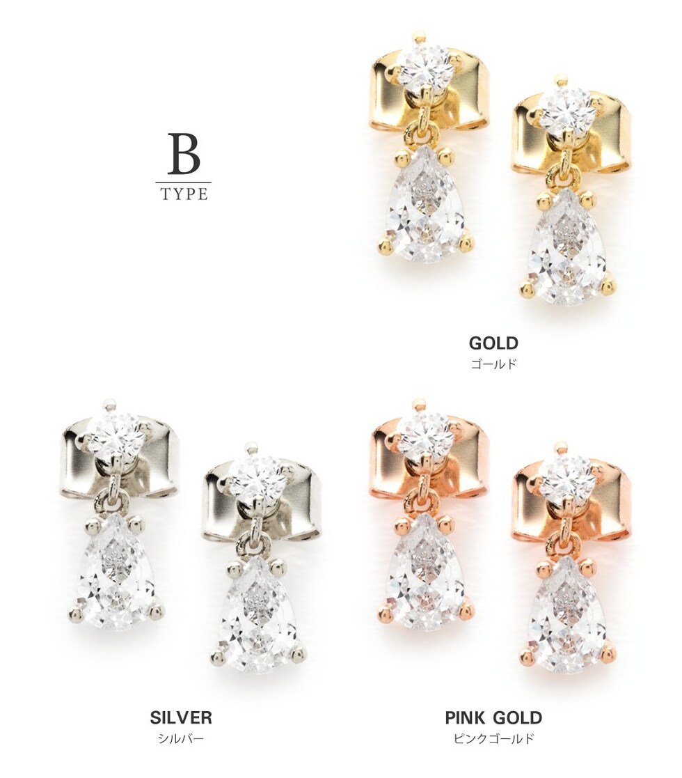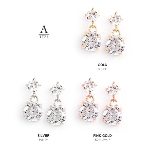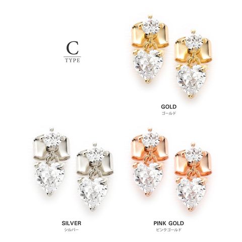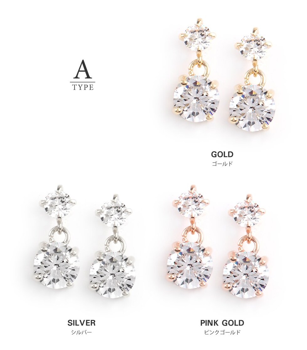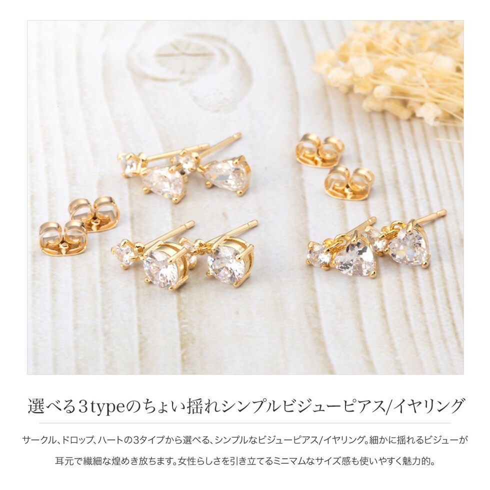 サークル、ドロップ、ハートの3タイプから選べる、シンプルなビジューピアス/イヤリング。