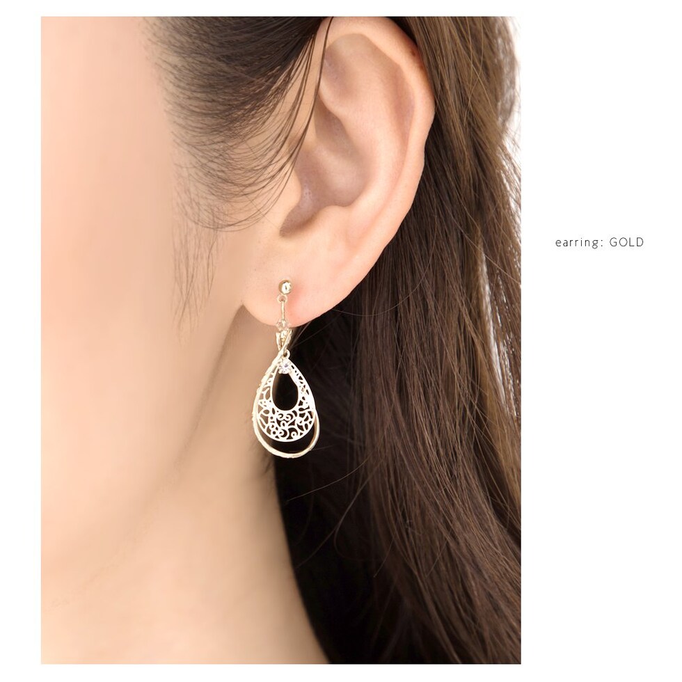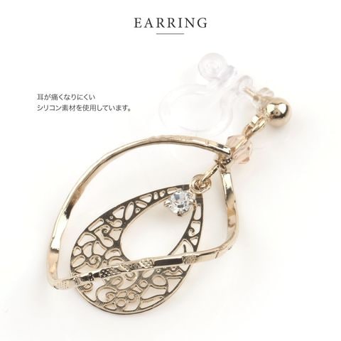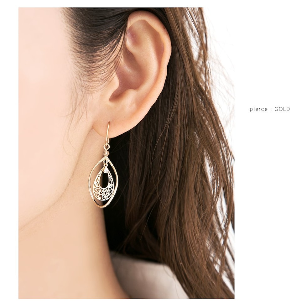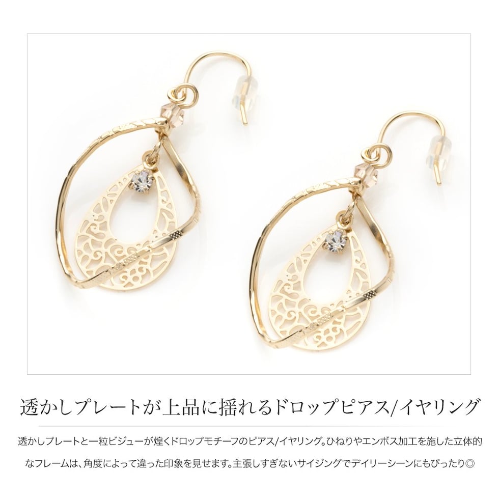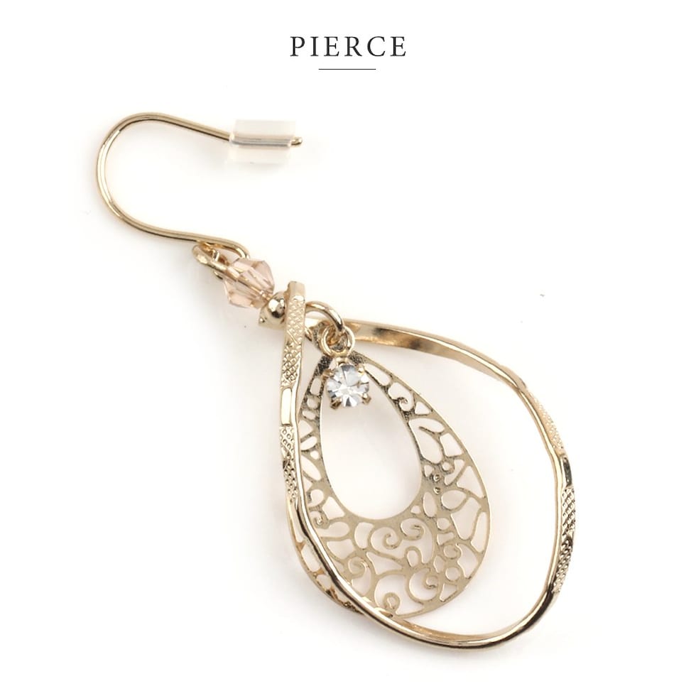 透かしプレートと一粒ビジューが煌くドロップモチーフのピアス/イヤリング。