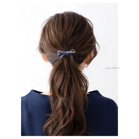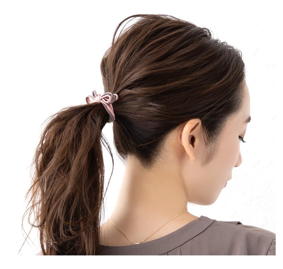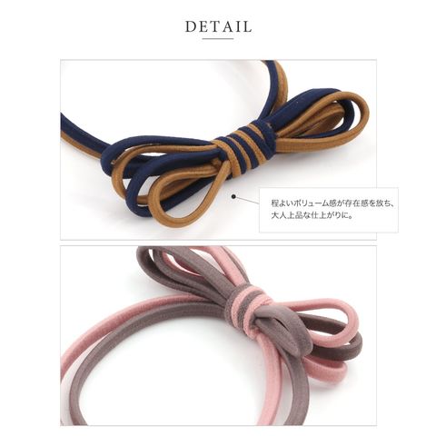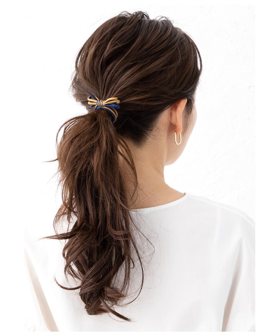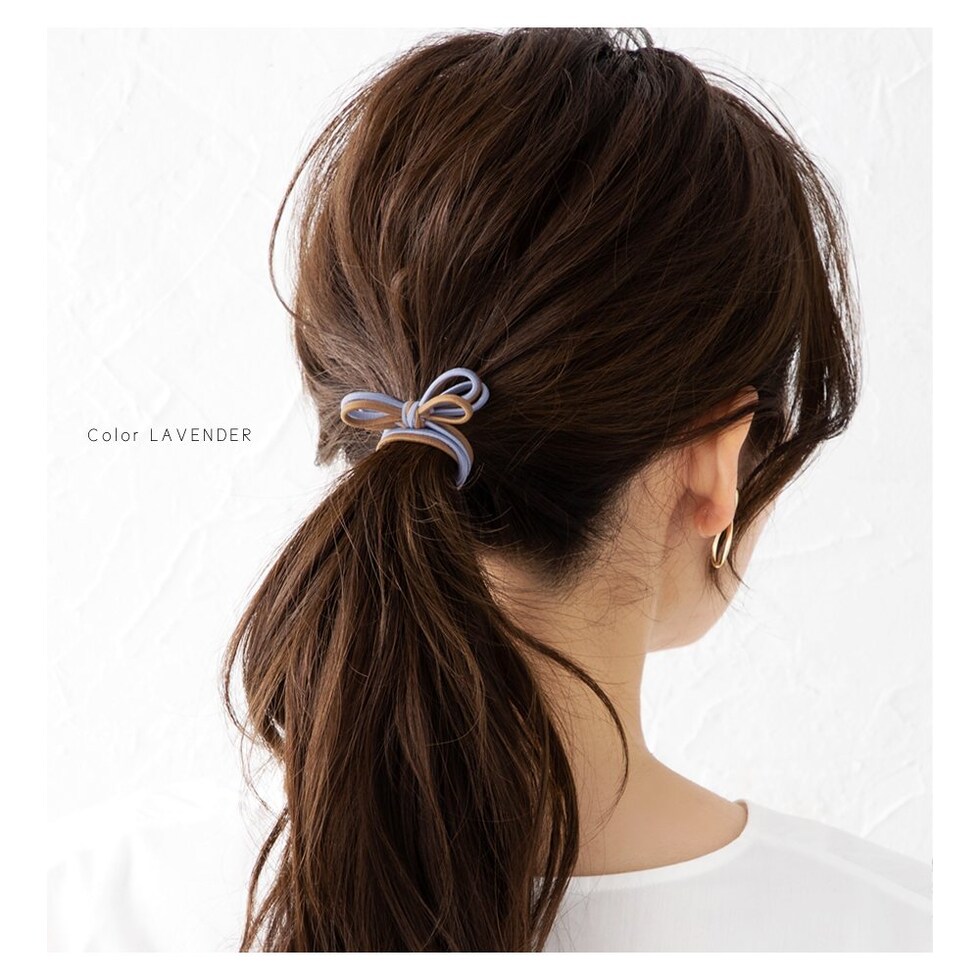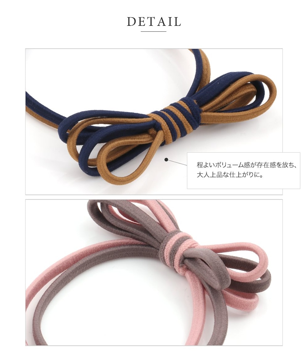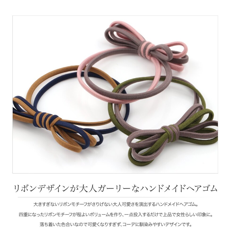 大きすぎないリボンモチーフがさりげない大人可愛さを演出するハンドメイドヘアゴム。四重になったリボンモチーフが程よいボリュームを作り、一点投入するだけで上品で女性らしい印象に。落ち着いた色合いなので可愛くなりすぎず、コーデに馴染みやすいデザインです。