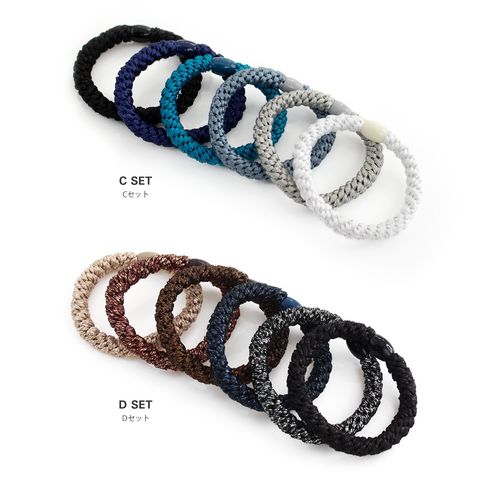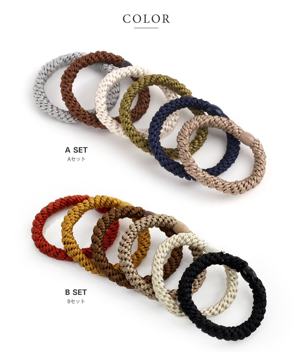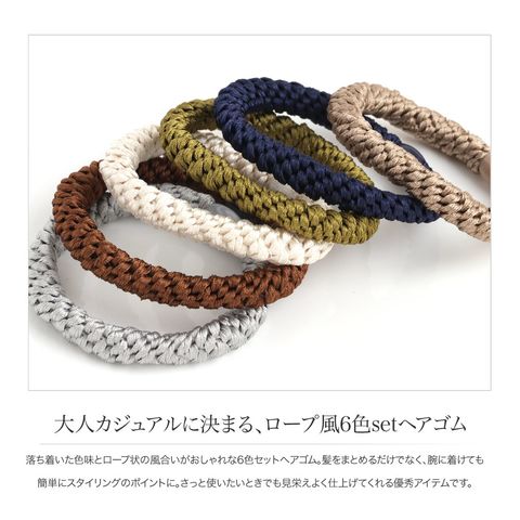 落ち着いた色味とロープ状の風合いがおしゃれな6色セットヘアゴム。髪をまとめるだけでなく、腕に着けても簡単にスタイリングのポイントに。さっと使いたいときでも見栄えよく仕上げてくれる優秀アイテムです。