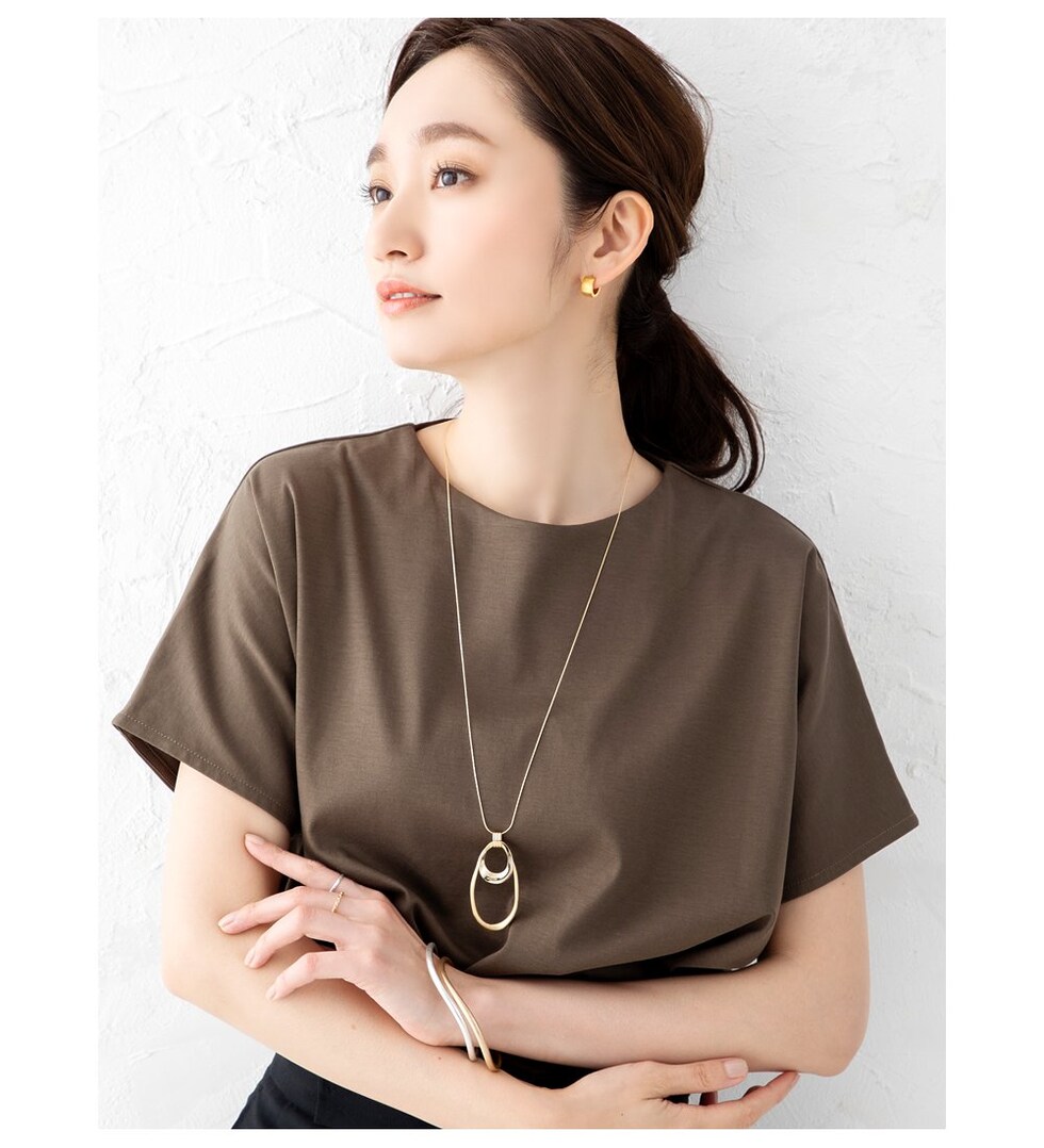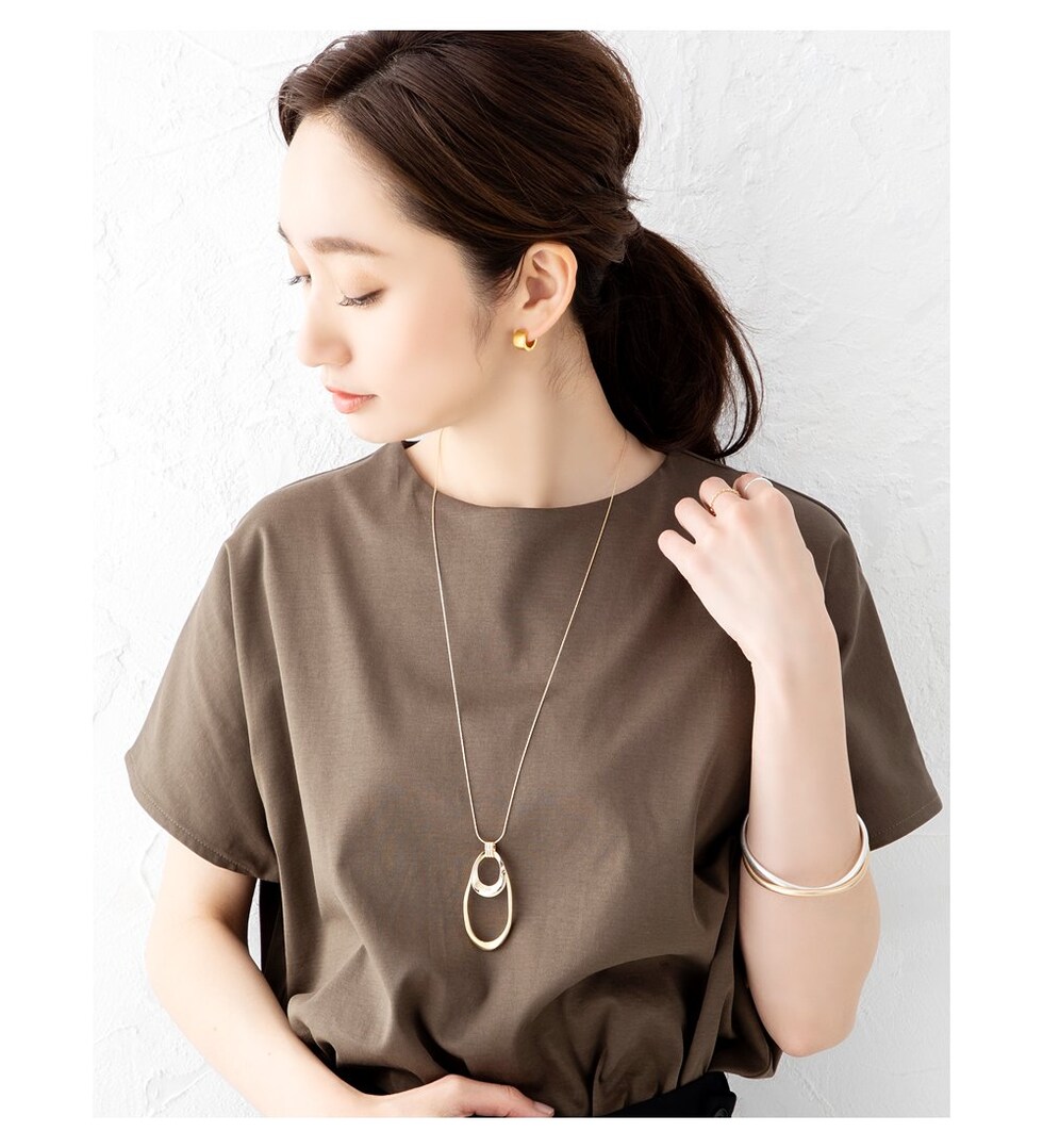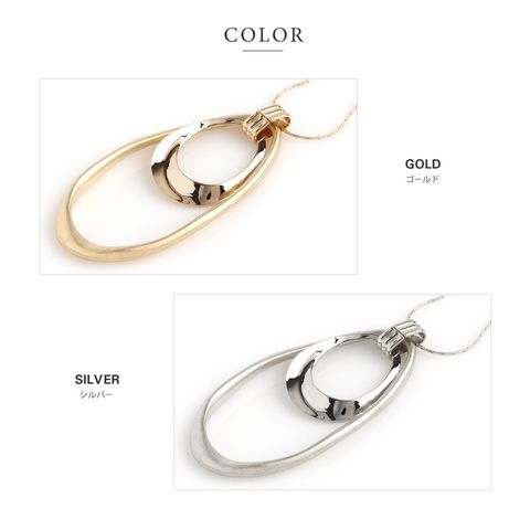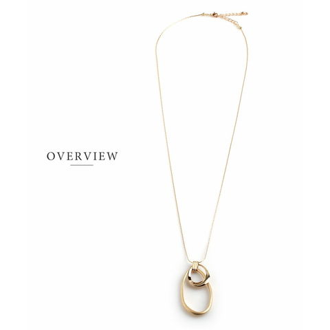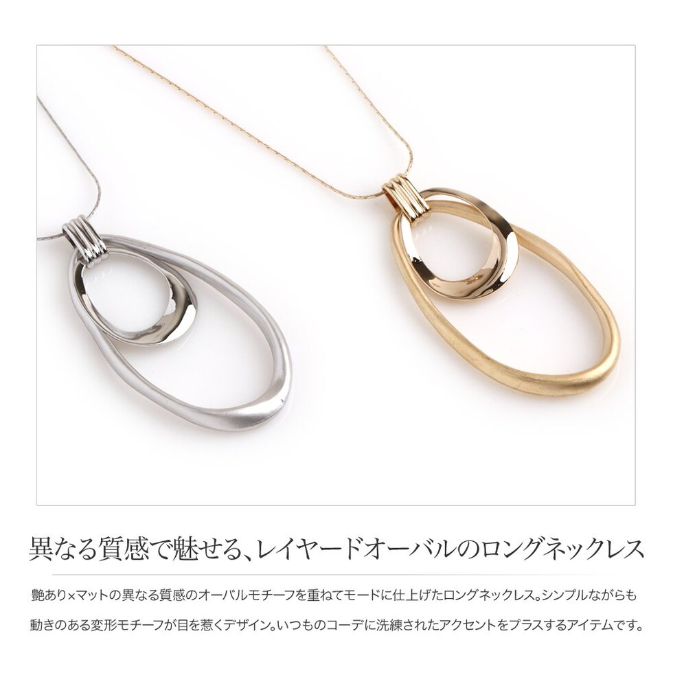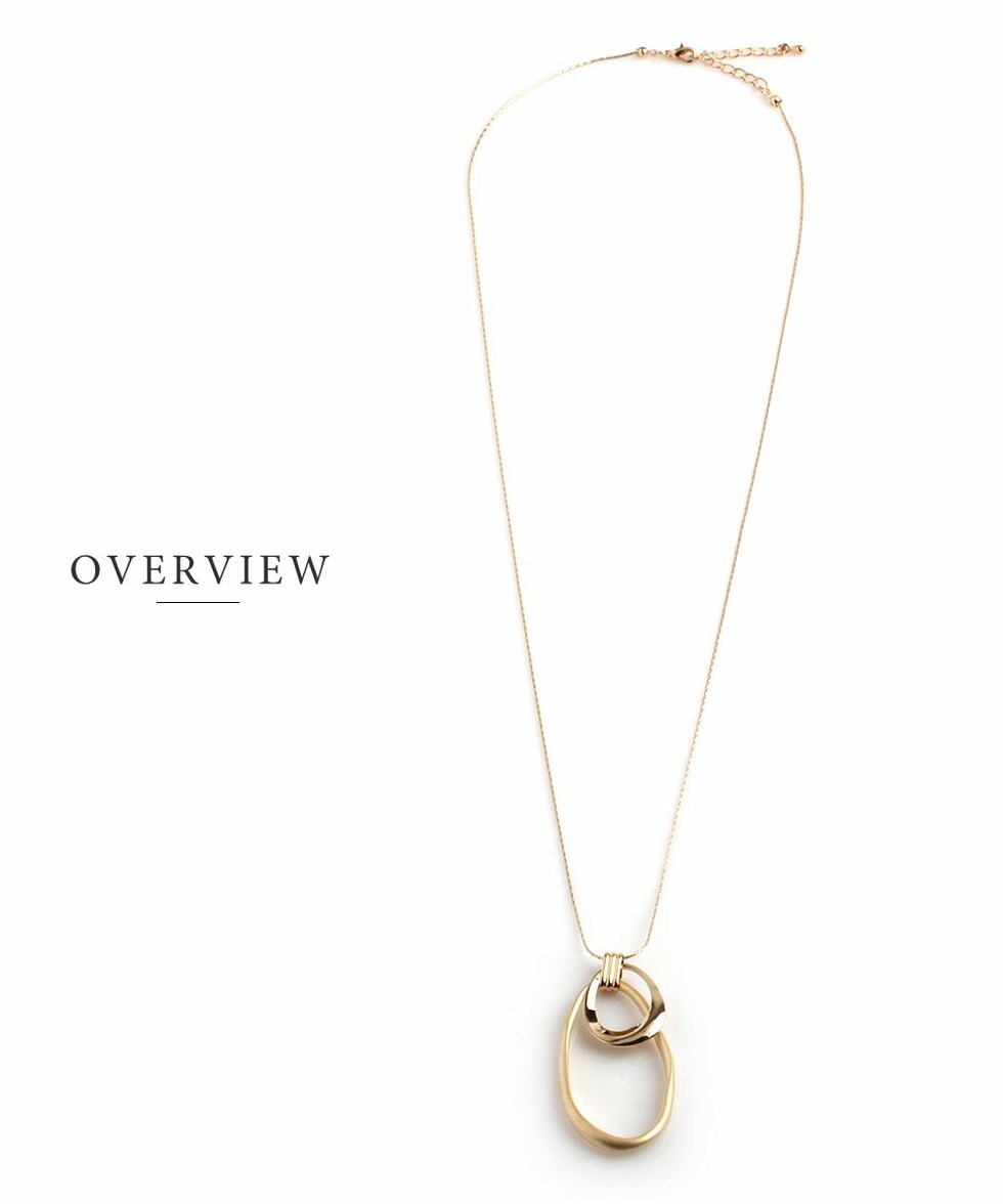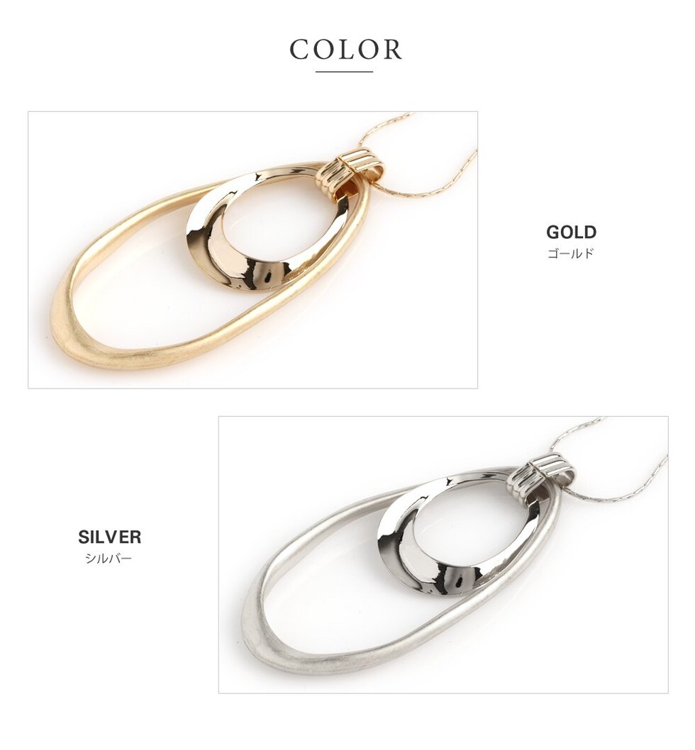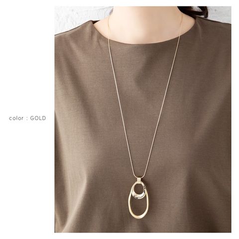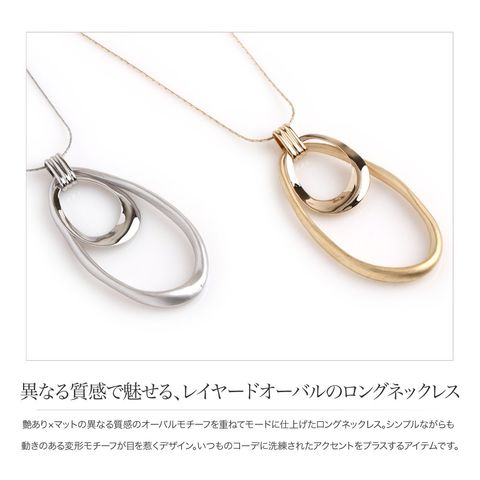 艶あり×マットの異なる質感のオーバルモチーフを重ねてモードに仕上げたロングネックレス。