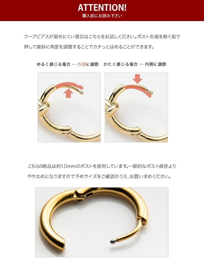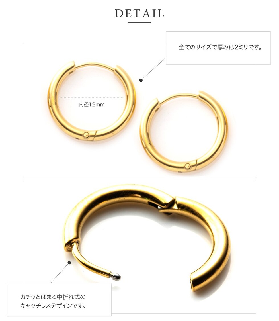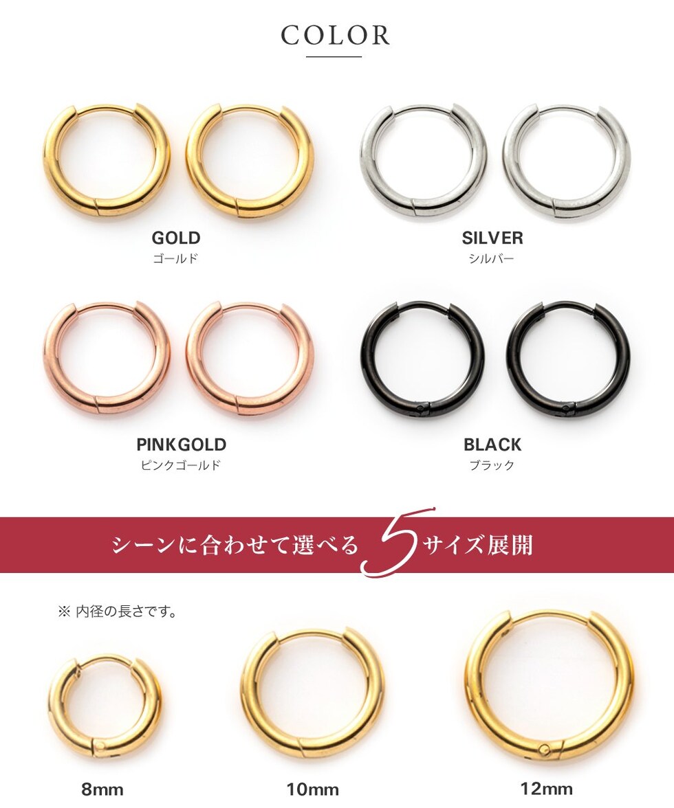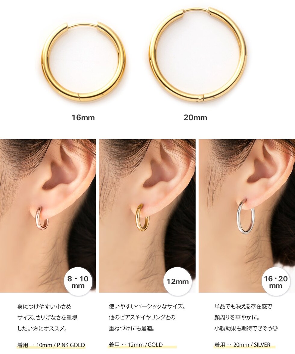 5つのサイズから選べてシンプルで使いやすいキャッチレスフープピアス。